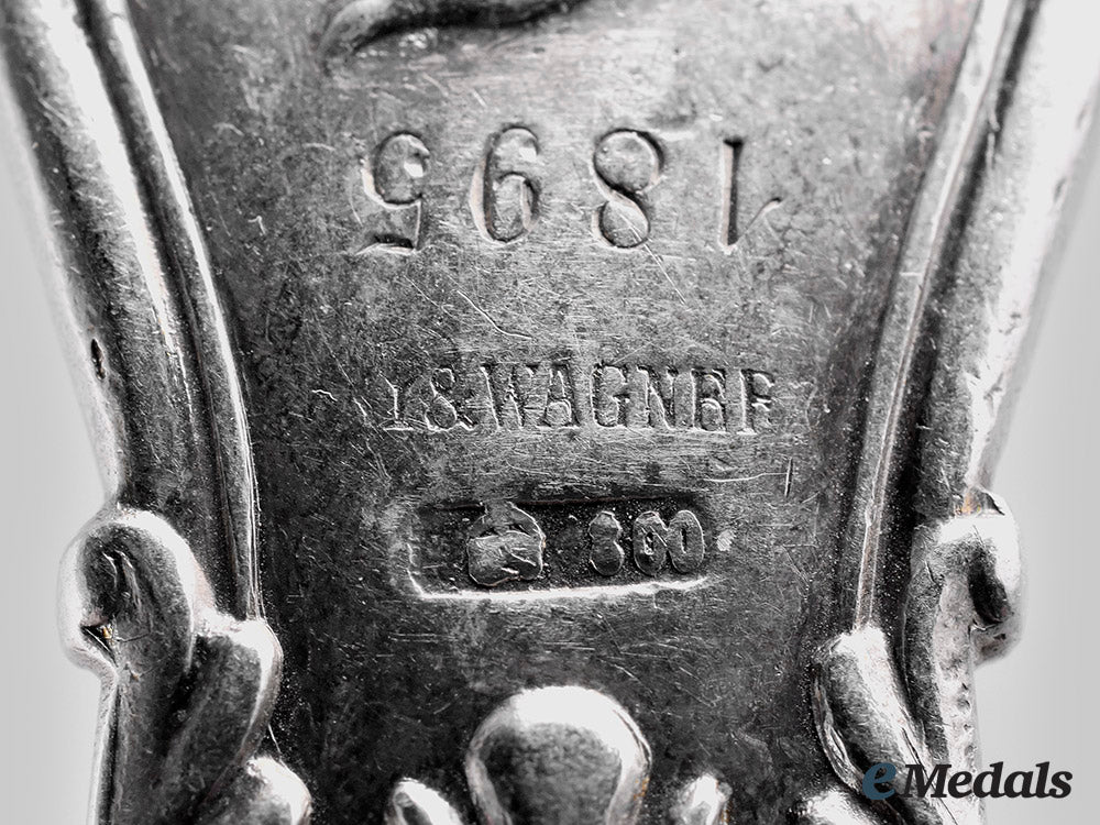 (Silberbesteck). A cutlery set from one of Kaiser Wilhelm II private residences; A spoon constructed of silver, the obverse presents an arabesque detailing at the shoulders, with a fluted stem and arabesque detailed handle with a central monogram of Kaiser Wilhelm II, ending with an arabesque tip, the reverse mimics the front, the handle bears the silver content mark of a crown and “800”, the maker mark “SY & WAGNER” and the date “1895”, measuring 185 mm (l) x 38.47 mm (w);