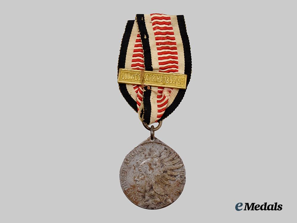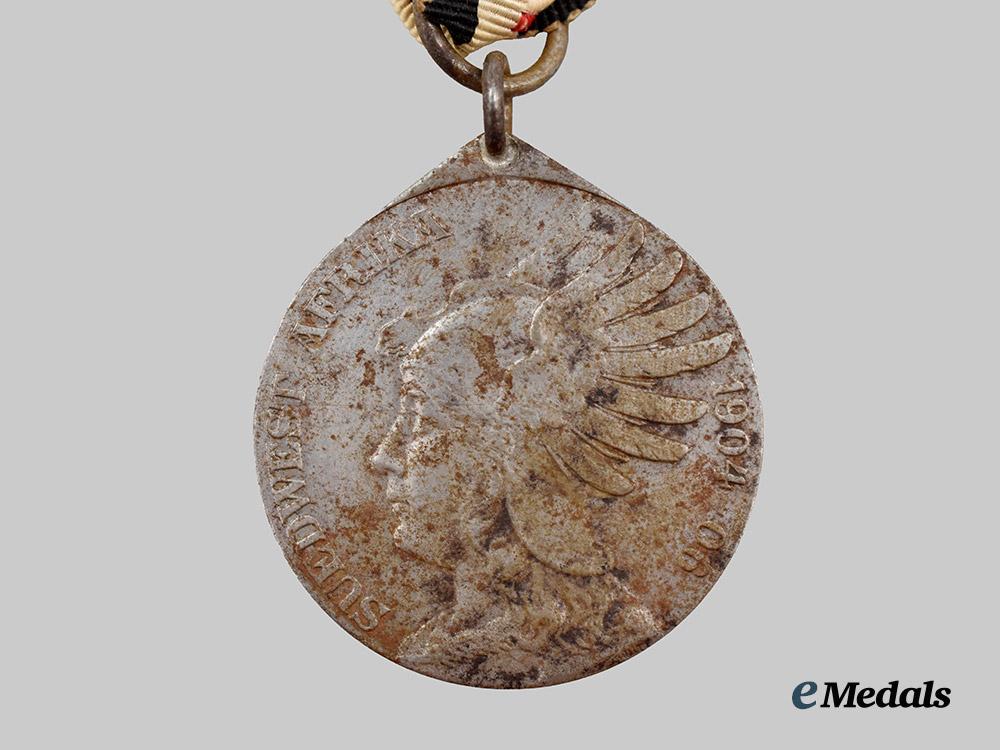 (Südwest-Afrika Denkmünze für Nichtkämpfer). Constructed of silvered magnetic steel, on loop for suspension from its period original ribbon with a 1893/95 campaign bar retrieved from a Colonial Medal, the obverse bearing a raised depiction of Germania, circumscribed by an inscription of “SUEDWEST AFRIKA 1904-06”, the reverse bearing a raised monogram of Kaiser Wilhelm II, circumscribed by an inscription of “VERDIENST UM DIE EXPEDITION” (“SERVICE TO THE EXPEDITION”), unmarked, measuring 32.67 mm in diameter, weighing 20.9 grams (inclusive of ribbon and bar), demonstrating surface oxidation throughout, an interesting and owner-modified example in fair condition.
