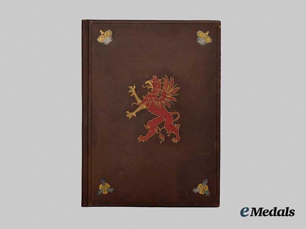 Presented to Otto von Bismarck on the occasion of his 80th Birthday. One issued by the Stolp-Schlawe-Rummelsburg Agricultural Association, constructed of a heavy card stock binding with a faux brown leather exterior binding, the cover bearing a central gilt and red griffin, with silvered and gilded crowns and oak leaf clusters situated at each corner, the interior retaining an elaborate card stock insert bearing a handwritten and illustrated dedication to von Bismarck from the Association, dated 1 April 1895, opening to reveal the handwritten signatures of members, measuring 29 cm (w) x 39 cm (h), in extremely fine condition.