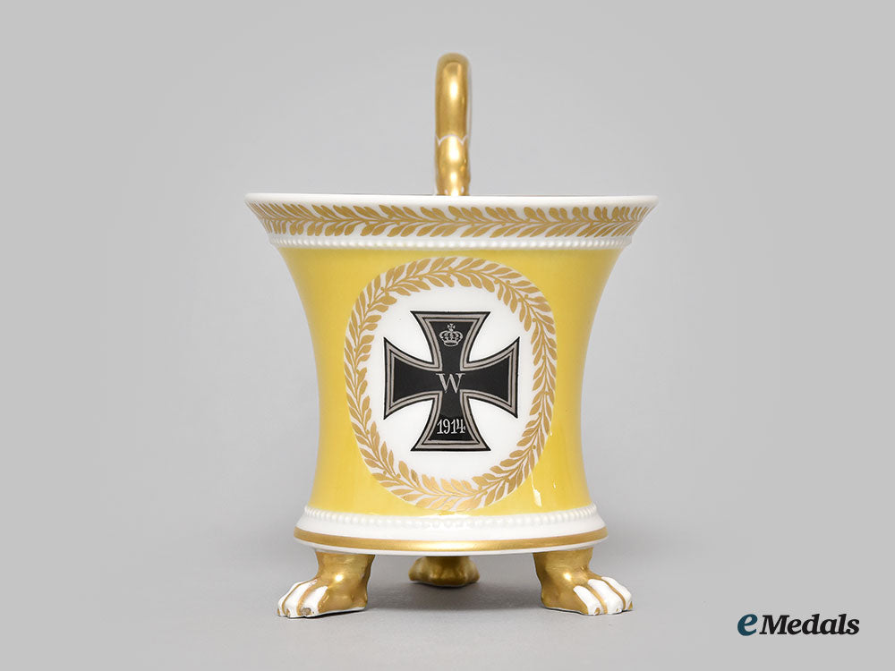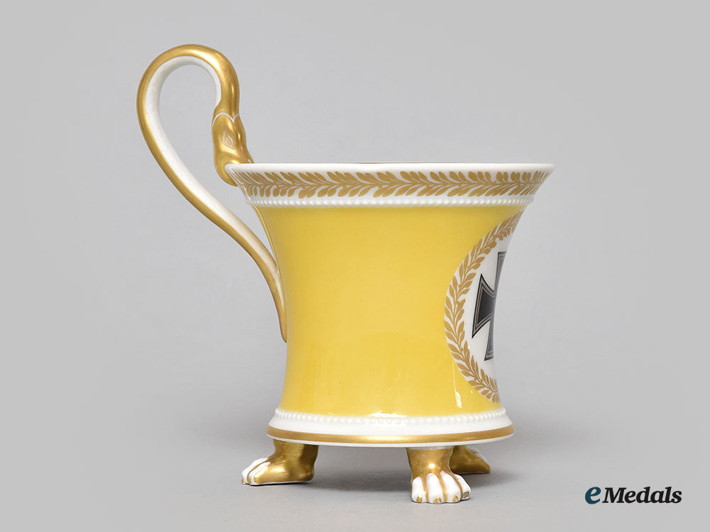 A large cup in yellow glazed porcelain, featuring a black iron cross motif encircled by a gilt wreath opposite the handle, the handle depicts a serpent with open mouth around the lip, delicate embossed pebbled line near the base and lip, the lip features a wreath pattern with the interior edge gilded, three claw feet along the base, the bottom is marked with the classic red orb, KMP and blue scepter, with two iron crosses, numbered 125/594, with a slightly impressed P.H mark, measures 121mm (w- including handle) x 128mm (h), minor chips and wear to the feet, light scratches to gilding on lip, remains in near extremely fine condition.