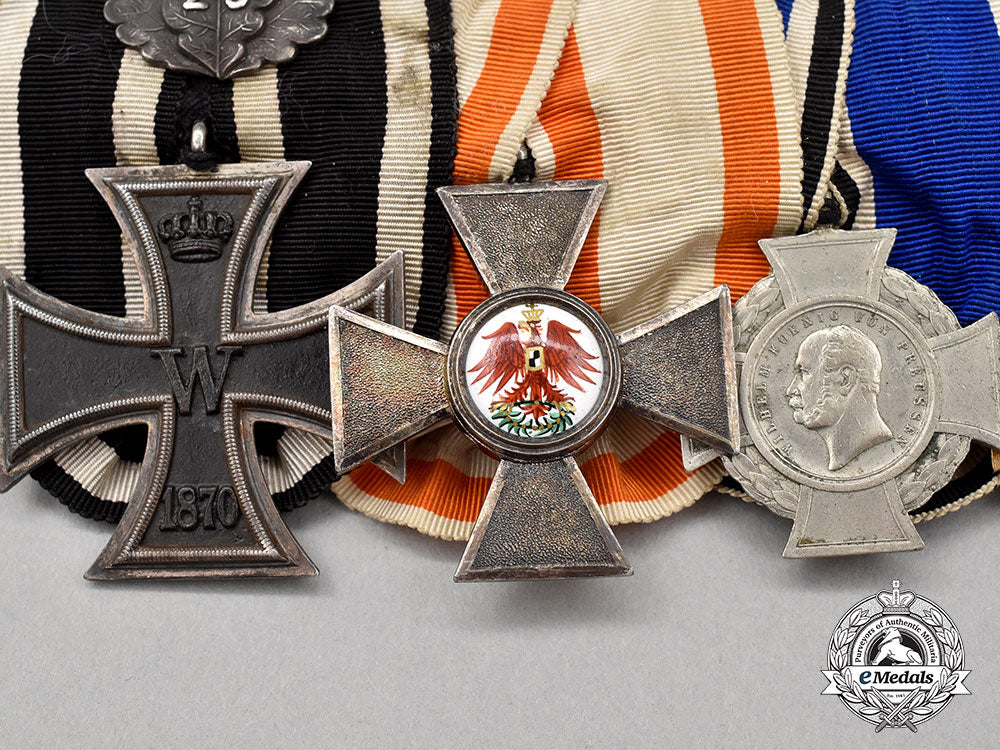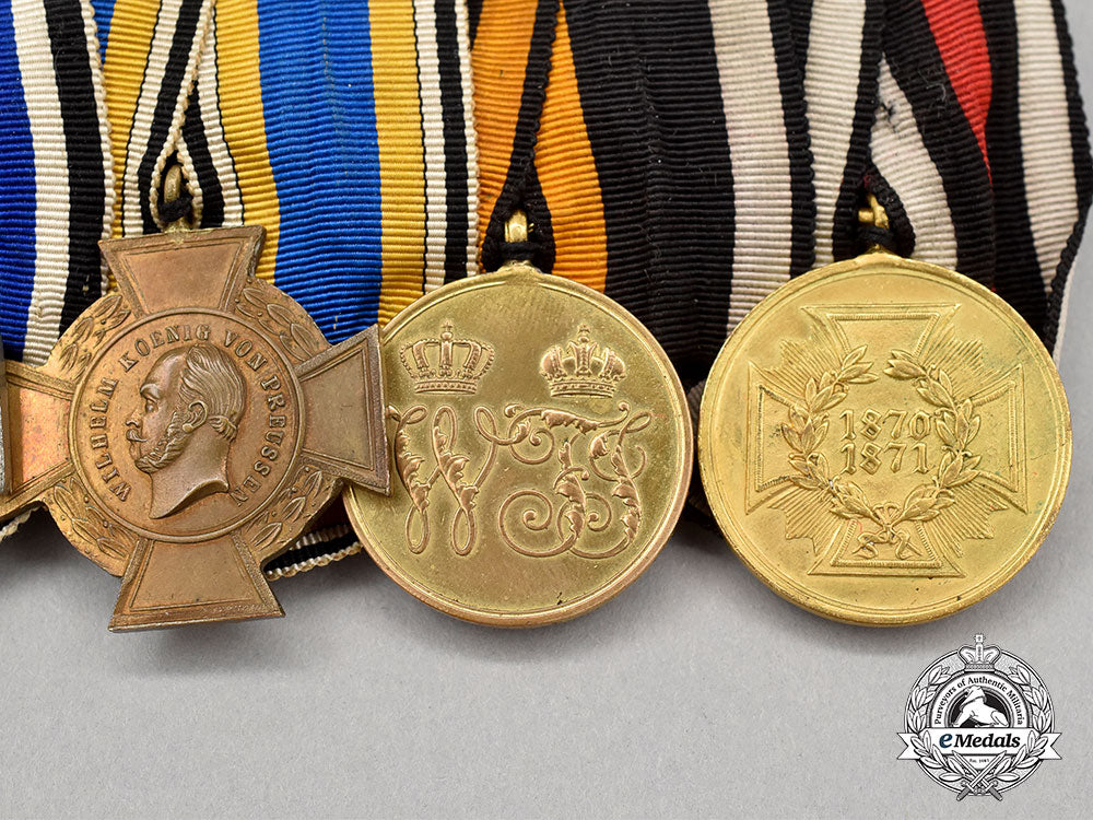 (Deutsch-Französischer Krieg Ordensschnalle). A rare and superb medal bar for a distinguished veteran of both the Franco-Prussian War and Second Schleswig War featuring six decorations, including: