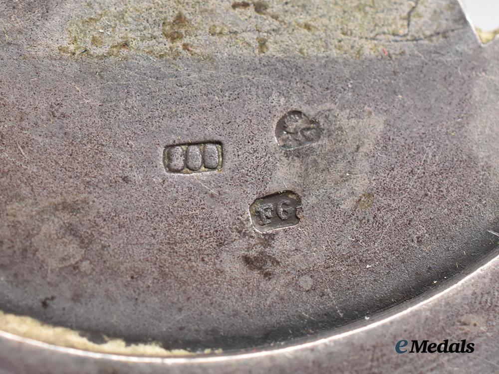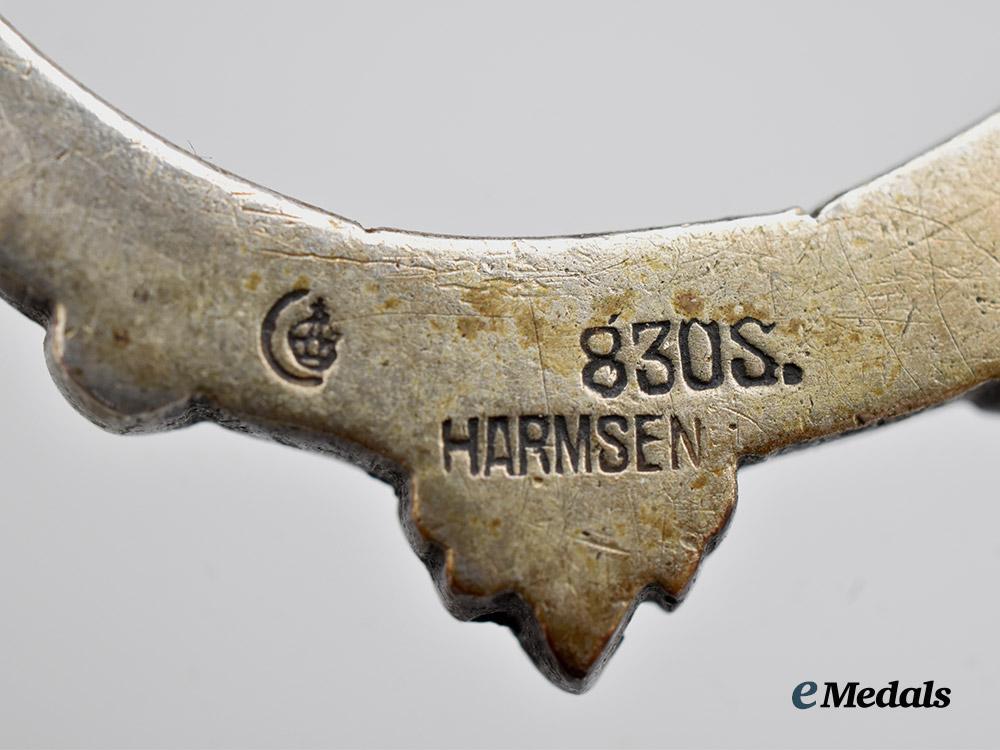 3. An ornate regiment commemorative pendant, constructed of silver, on loop for suspension from its period original ribbon executed in a House Order of Hohenzollern-style colour scheme, the reverse stamped with a mark of “HARMSEN”, a crown and crescent indicating German manufacture, and a silver content number of “830S”, measuring 44 mm (w) x 63 mm (h), weighing 29.8 grams (inclusive of ribbon), in extremely fine condition.