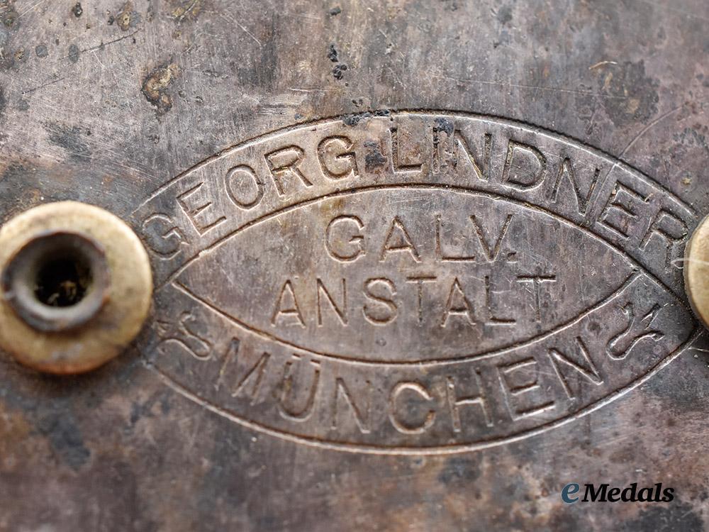 1. A Gymnastics Association commemorative badge, constructed of silvered bronze, vertical pinback, the reverse with two blasted rivets securing the obverse plaque in position, maker marked “GEORG LINDNER, MÜNCHEN”, measuring 44 mm (w) x 60 mm (h), in near extremely fine condition.