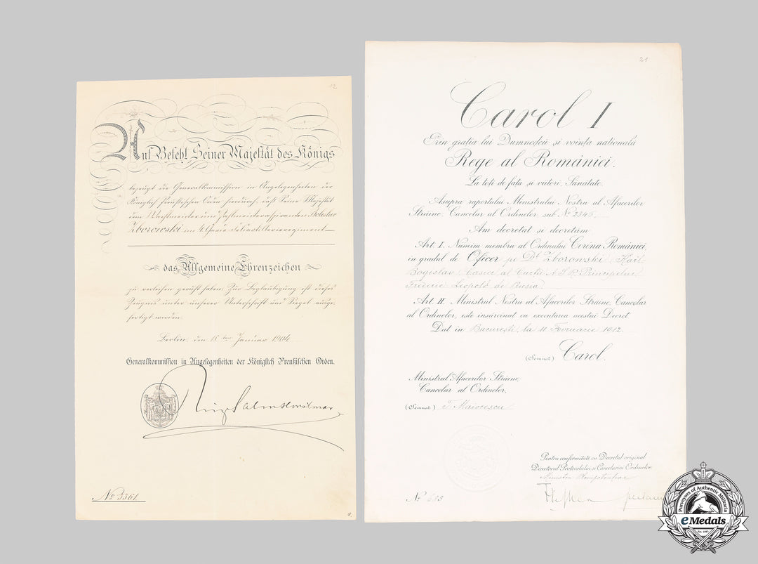 A Romanian Order of the Crown Officer certificate to Karl-Bogislav Zborowski, paymaster of the royal court of Prince Friedrich Leopold of Prussia (1865-1931), dated to Bucharest on 11 February 1912. Measuring 240 mm (w) x 358 mm (h), presenting a folding crease, and light creasing and scuffing of the edges, remains very fine.