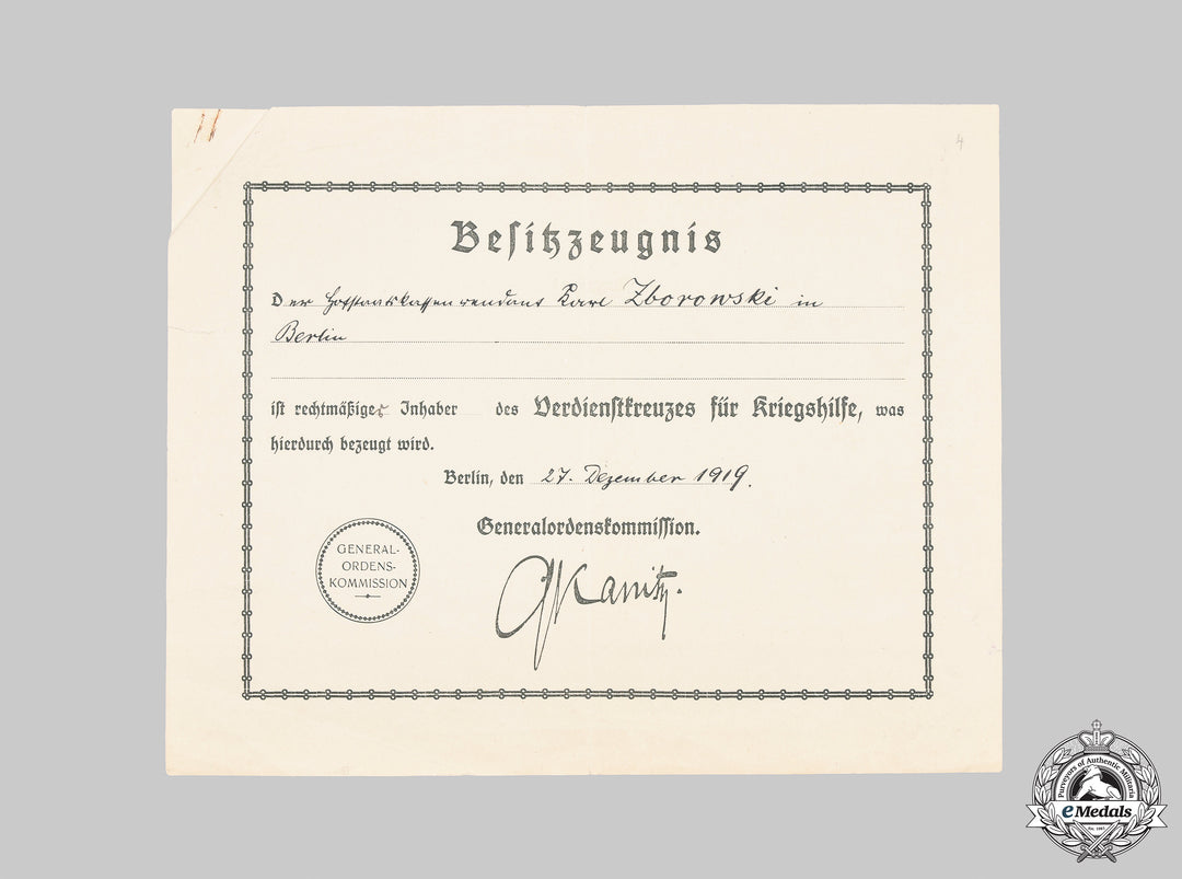 A Prussian Merit Cross for War Aid certificate to Hofstaatskassenrendant (royal court paymaster) Karl Zborowski, dated to Berlin on 27 December 1919. Measuring 258 mm (w) x 208 mm (h), presenting a folding crease, some overall creasing, light scuffing of the edges, and one minor tear, remains fine.