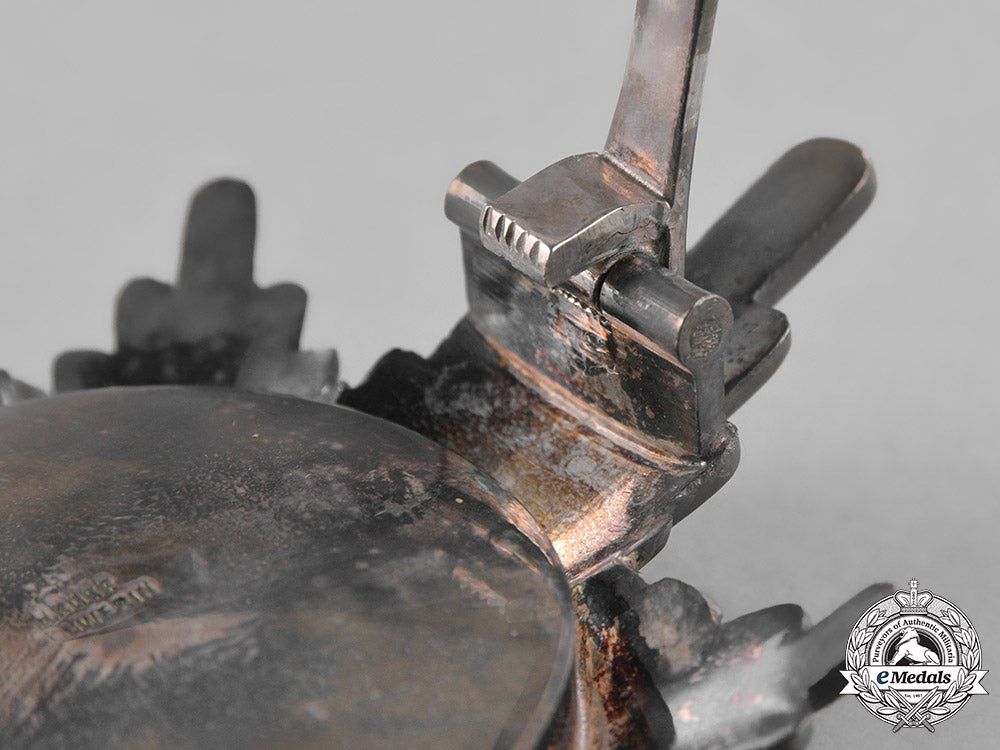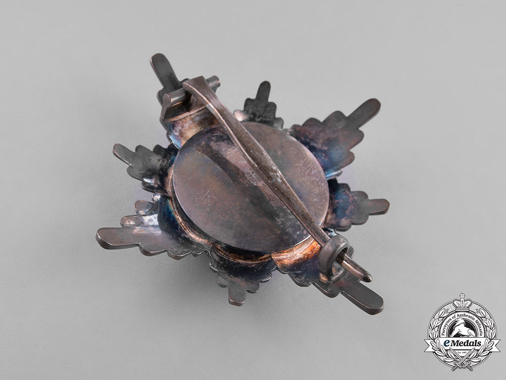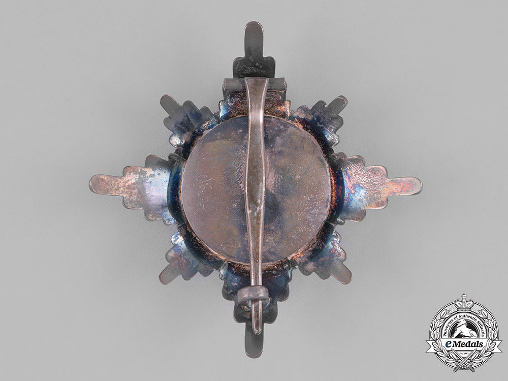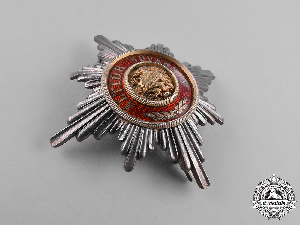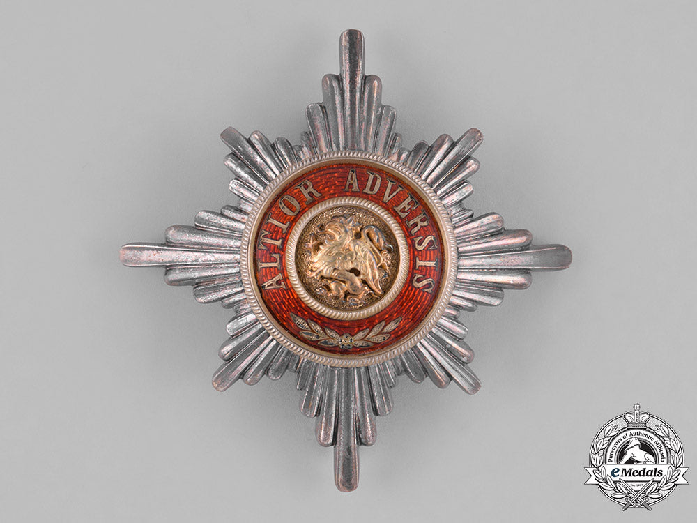 (Greiffen-Orden, Bruststern zum Komturkreuz). Instituted in 1884 by Großherzog Friedrich Franz IV. (Issued 1884-1918). An eight pointed multi-rayed star alternating between strands of larger rays and smaller rays, the obverse with a central pebbled medallion in silver gilt bearing a leftward facing griffin, surrounded by a knurled ring, a broad red enameled ring inscribed “ALTIOR ADVERSIS” (Against all Odds) in silver gilt, the reverse plain, with a vertical pinback and a functional hinge/catch assembly, marked “H. Rose, Schwerin” on the reverse, measuring 79.22 mm (w) x 80.46 mm (h), weighing 65.2 grams, extremely fine.