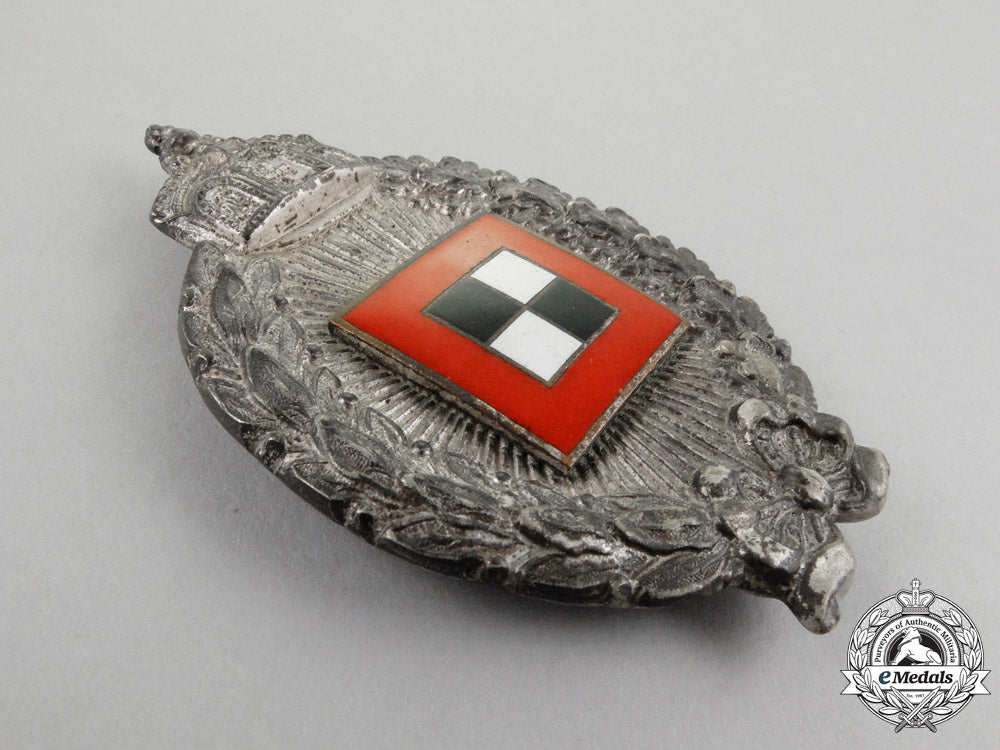 A first war Prussian “Beobachterabzeichen”; in silvered feinzink; hollow construction; with an enameled square insignia consisting of white, black, and red enamels mounted to the center of the badge via two hooks on the reverse; the square insignia placed within a bed of sun rays and a wreath consisting of oak and laurel leaves, and with a bow on the bottom, and a Prussian crown on the top of the wreath; unmarked; measuring 72.36 mm x 45.47 mm; the hinge broken off on the reverse, unmarked however exhibiting the manufacturing characteristics of Paul Meybauer, with light traces of oxidation on the frame of the enameled square; in overall near very fine condition.