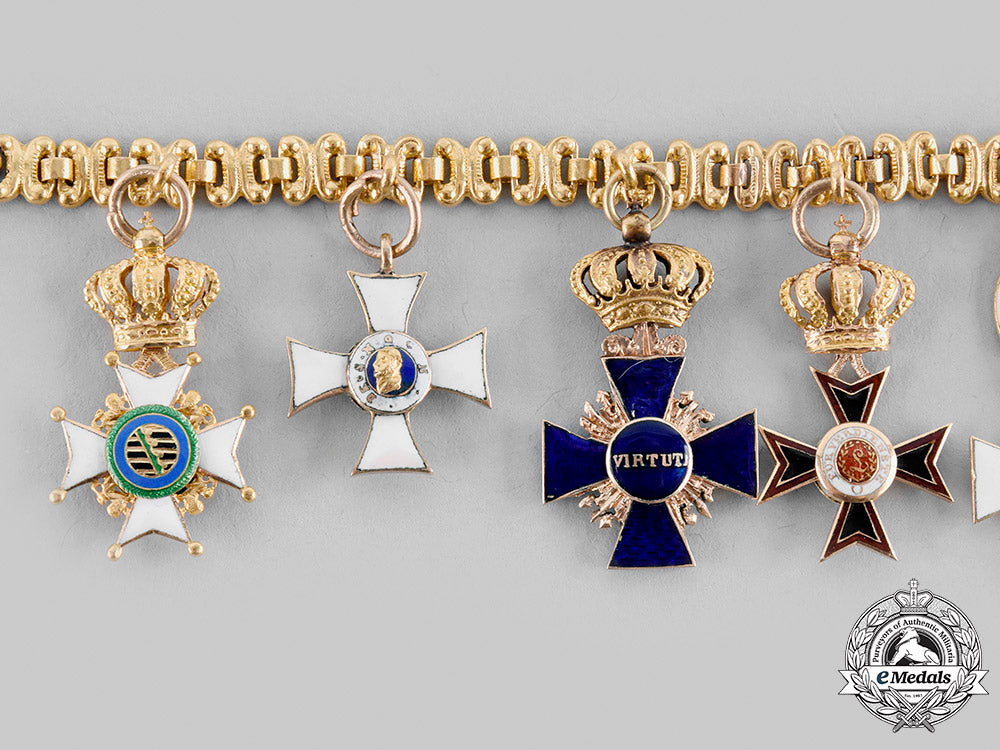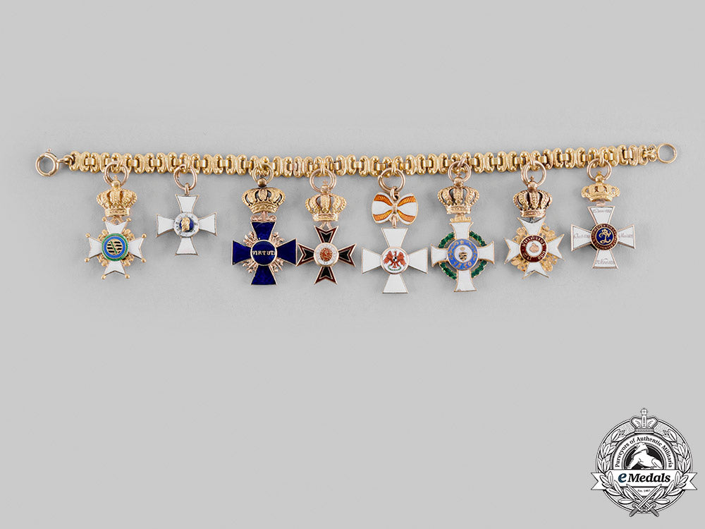 Of high quality manufacture, a superb and extremely rare miniature decoration chain, consisting of multiple locks finely connected by small rings, with delicate and functional spring rings at the ends, measuring 170 mm in length, with a total weight of 28.8 grams (inclusive of the awards), presenting unidentifiable maker’s mark in one spring ring, scarce set in near mint condition. The chain features eight miniature Orders from different German States, in their civil division versions; from left to right, the chain is composed of: