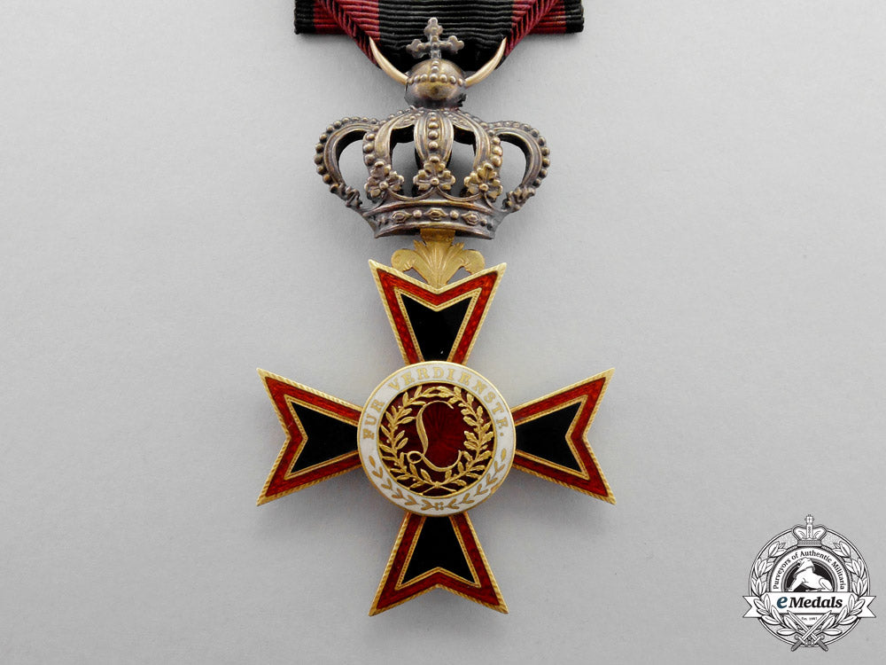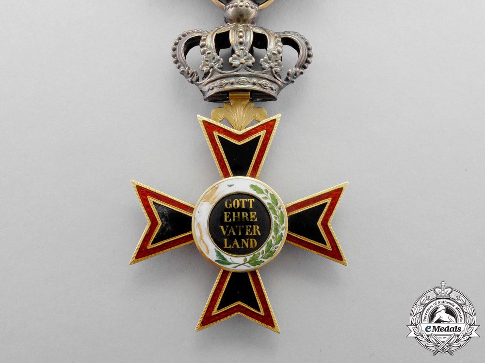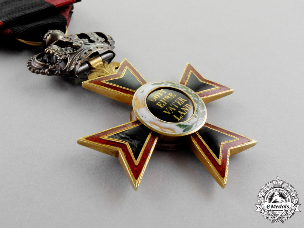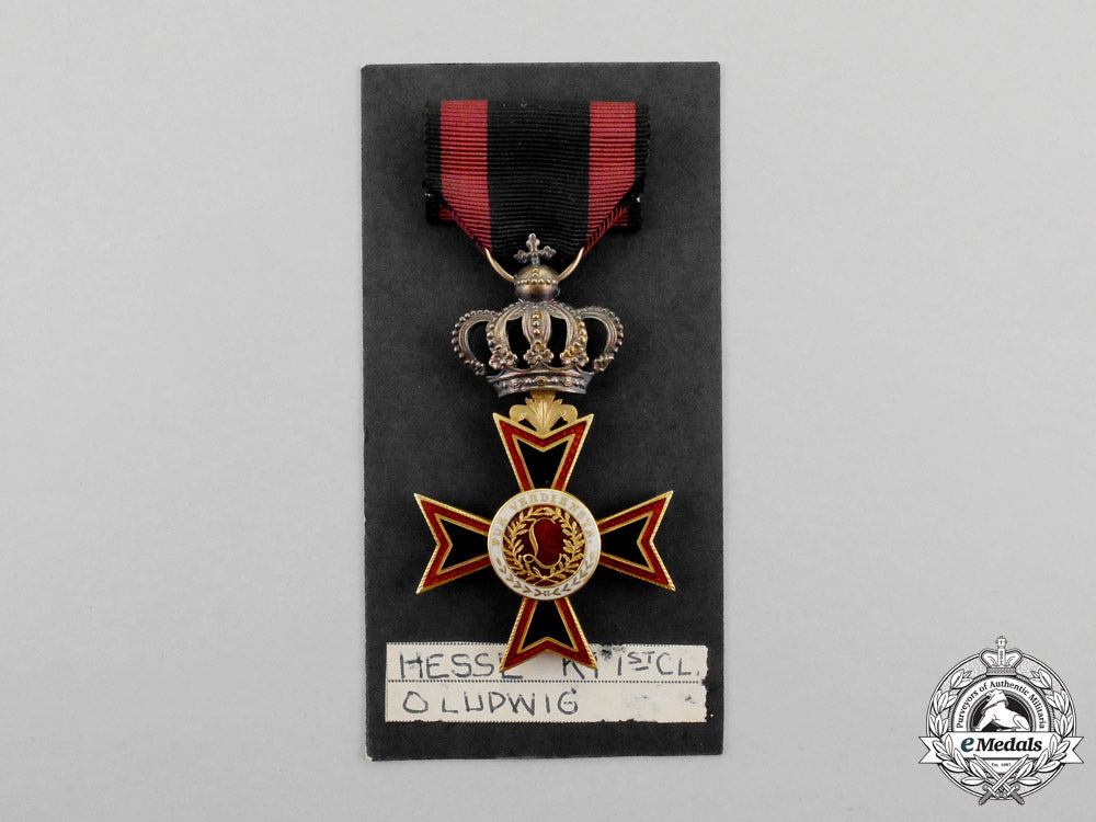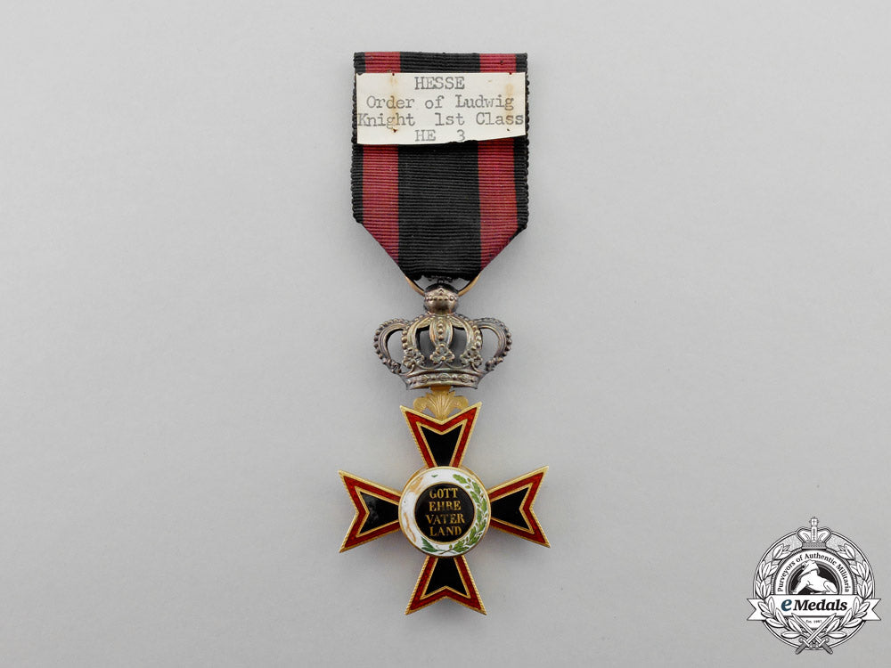 A fine example of a 1831-1912 issue Hesse-Darmstadt Ludwigs Order Knight’s Cross First Class (Hessen-Darmstadt Ludwigsorden Ritterkreuz I Klasse); a gold Maltese cross with black and red enamels; the obverse with a central red enameled center applique with the golden royal monogram of Ludwig, surrounded by open ended laurel leaf stems, with a white enameled ring inscribed “Für Verdienste) (German - For Service), with more laurel leaf twigs below; the reverse with a black enameled medallion, inscribed “Gott, Ehre, Vaterland” (German - God, Honour, Fatherland) in golden lettering, surrounded by a white enameled ring with green laurel leaf twigs; suspended from a swivel crown suspension, with a horizontally pierced ball and loop, and with its period original ribbon; measuring 44.26 mm x 74.64 mm; weighing 21.2 grams; single flak to reverse 9 o'clock arm and centre, near very fine..