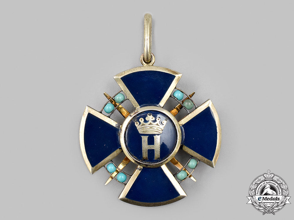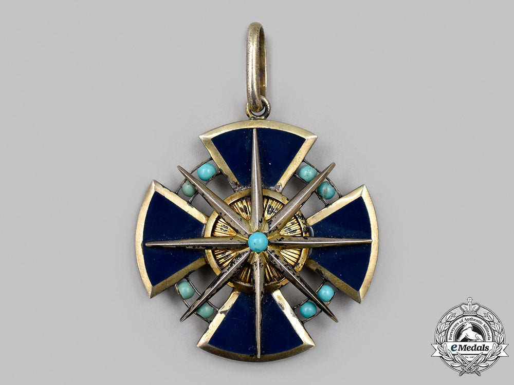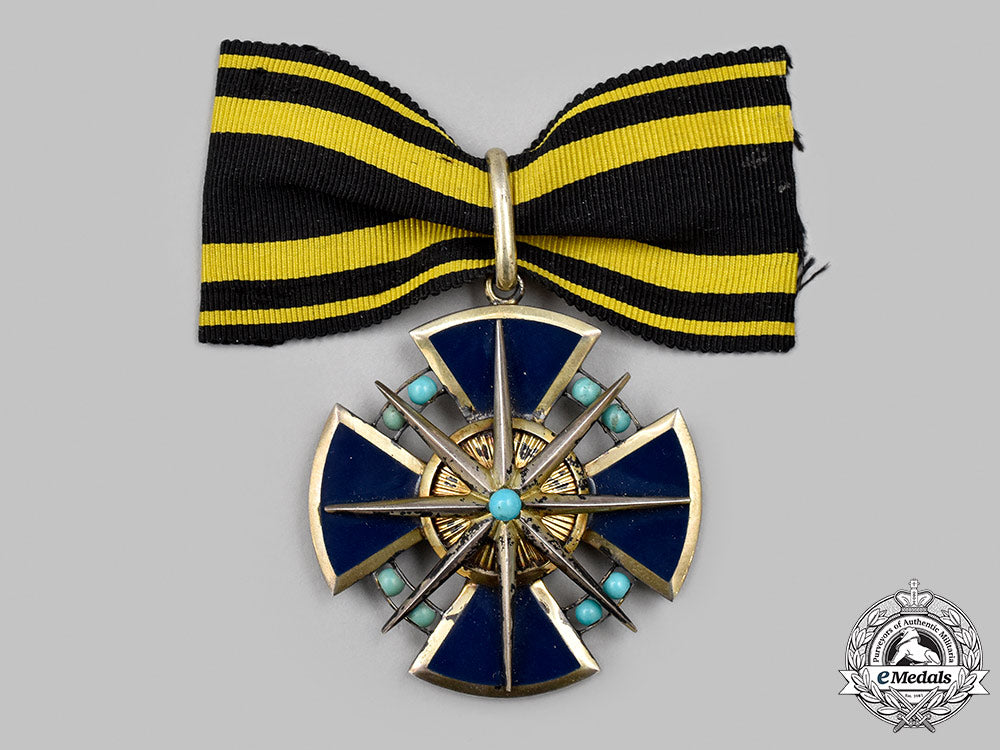 (Stern vom Brabant Ehrenkreuzdame). Instituted 24 June 1914. (1914-1918 issue). Constructed of gilded silver with multi-coloured enamels, consisting of a Cross Pattée with dark blue enameled arms, joined through the quadrants by eight turquoise spheres held in place with dual silver gilt bands, the obverse bearing a central ribbed gilt medallion, overlaid by an eight-pointed gilt star with an additional turquoise sphere centrepiece, the reverse bearing a central dark blue enameled medallion overlaid by a silver monogram of Duke Heinrich, the twelve o’clock arm with an integral loop connecting to a suspension ring retaining a period original ribbon, unmarked, measuring 44.14 mm (w) x 48.47 mm (h), weighing 23.7 grams, with minor flecking and loss of finish evident to the enamels and gilt, respectively, an exceptionally rare decoration in extremely fine condition.