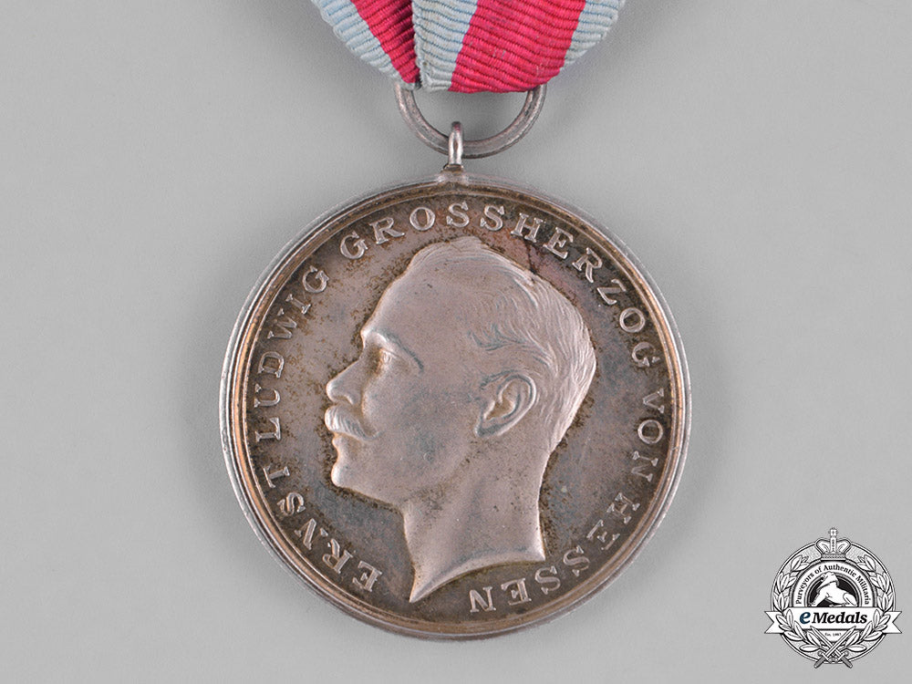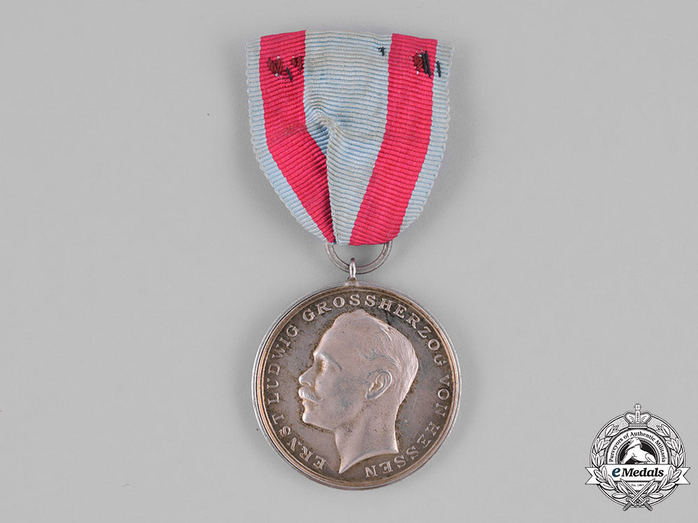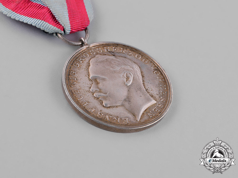 (Silberne Medaille für Verdienste). Instituted 1850 by Grand Duke Ludwig III. (Issue 1917-1918). A round silver medal, the obverse depicting the leftward facing head of Grand Duke Ludwig III, circumscribed by his name and title, the reverse inscribed “FÜR TAPFERKEIT” (For Bravery) within a laurel and oak wreath, on a loop for suspension from its shortened period original ribbon, measuring 33.54 mm in diameter, weighing 14.0 grams with its ribbon, light contact marks, in overall very fine condition.