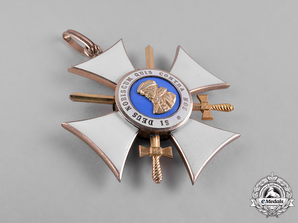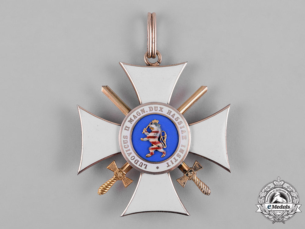 (Orden Philipps der Großmüthigen, Großkreuz). Instituted on 1 May 1840 by Ludwig II von Hessen. Type II. (1849-1918 Issue). A Grand Cross sash badge consisting of a white-enameled cross pattée in gilded silver with swords in each quadrant, the obverse with a light blue enameled medallion bearing the leftward facing bust of Philip the Magnanimous in Gold, surrounded by a white enameled ring inscribed SI DEUS NOBISCUM QUIS CONTRA NOS (If God is with us, who is against us) in Gold, the reverse with a light blue enameled medallion bearing a rampant lion in multi-coloured enamels, surrounded by a ring of white enamels, inscribed LUDOVICUS II MAGN. DUX HASSIAE INSTIT in Gold, stamped SILBER on integral ring, unmarked however presenting characteristics of 1930's Zimmermann manufacture, measuring 58.91 mm (w) x 63.62 mm (h), weighing 42.6 grams, on a loop for suspension from period original silk sash, and in extremely fine condition.