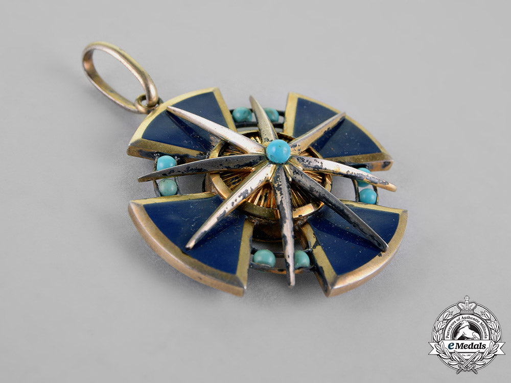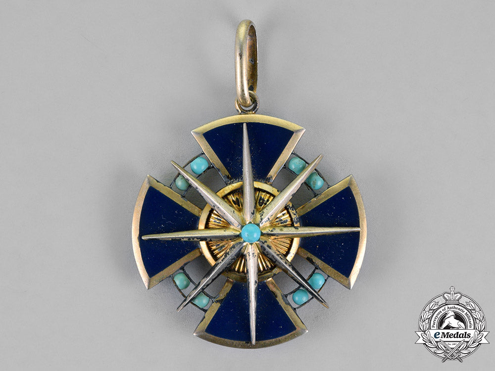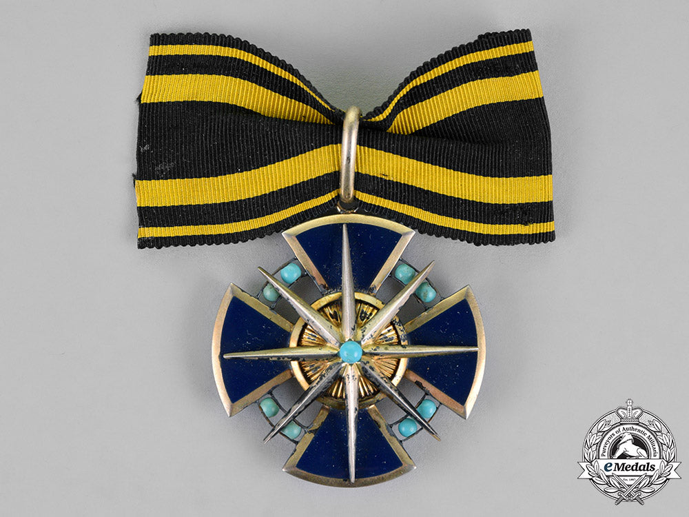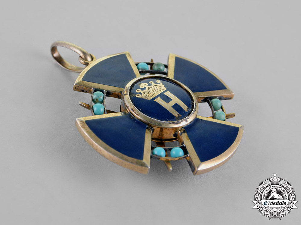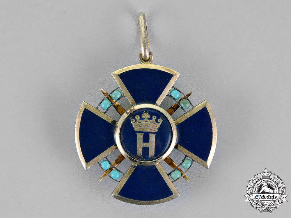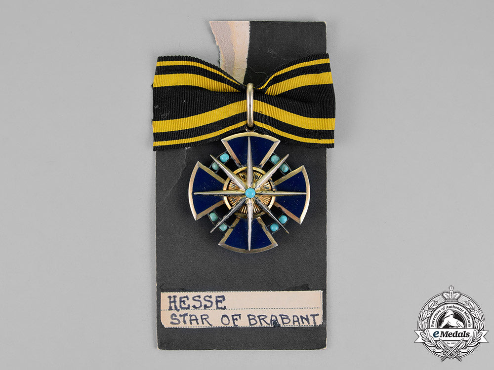 (Stern vom Brabant Ehrenkreuzdame). Instituted 1914. An extremely rare cross constructed of silver gilt with rounded arms, with a gilt eight-pointed star superimposed in the centre of the badge behind a round silver gilt applique; the obverse with the arms of the cross in blue enamels, with two turquoise balls in-between each of the arms of the cross, as well as with a single turquoise ball on-top of the eight-pointed star; the reverse with a central enameled medallion bearing the letter “H” for “Heinrich”, topped by a royal Hessian crown; on a broad loop for suspension from a period original shortened ribbon; of a reduced size measuring 44.15 mm (w) x 48.49 mm (h); weighing 23.7 grams; in overall near extremely fine condition.
