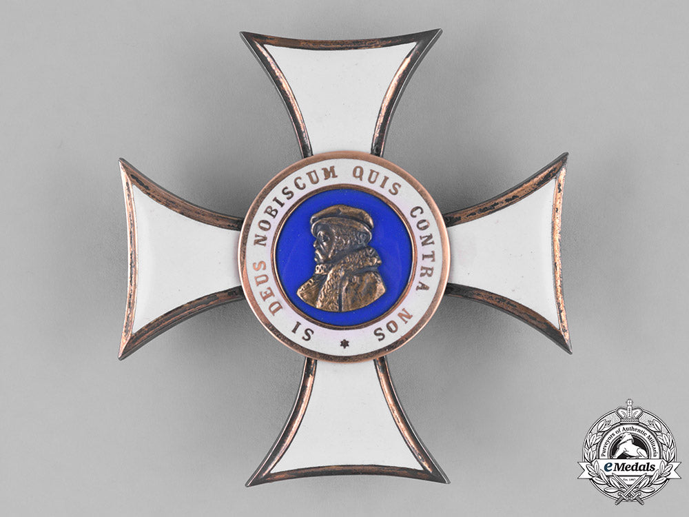 (Orden Philipps des Großmütigen, Bruststern zum Komturkreuz). Instituted on 1 May 1840 by Grand Duke Ludwig II. Type II. (1849-1918 Issue). A silver cross pattée with white-enamelled arms, centre obverse presents a left-facing golden bust of Philip over a blue-enamelled field, circumscribed by a white-enamelled ring, bordered and set in Gold, bearing the inscription SI DEUS NOBISCUM QUIS CONTRA NOS (IF GOD IS FOR US WHO CAN BE AGAINST US), reverse centre presents a principle pin assembly, measuring 59.20 mm (w) x 59.58 mm (h), weighing 39.4 grams, and extremely fine.