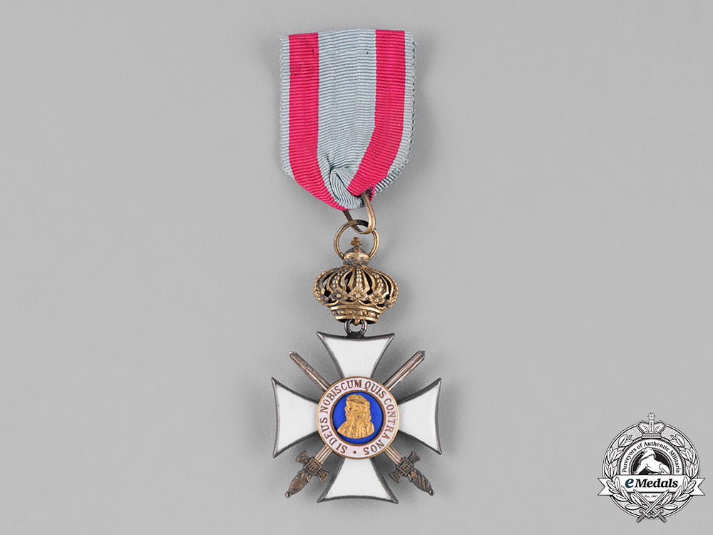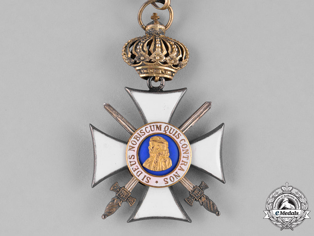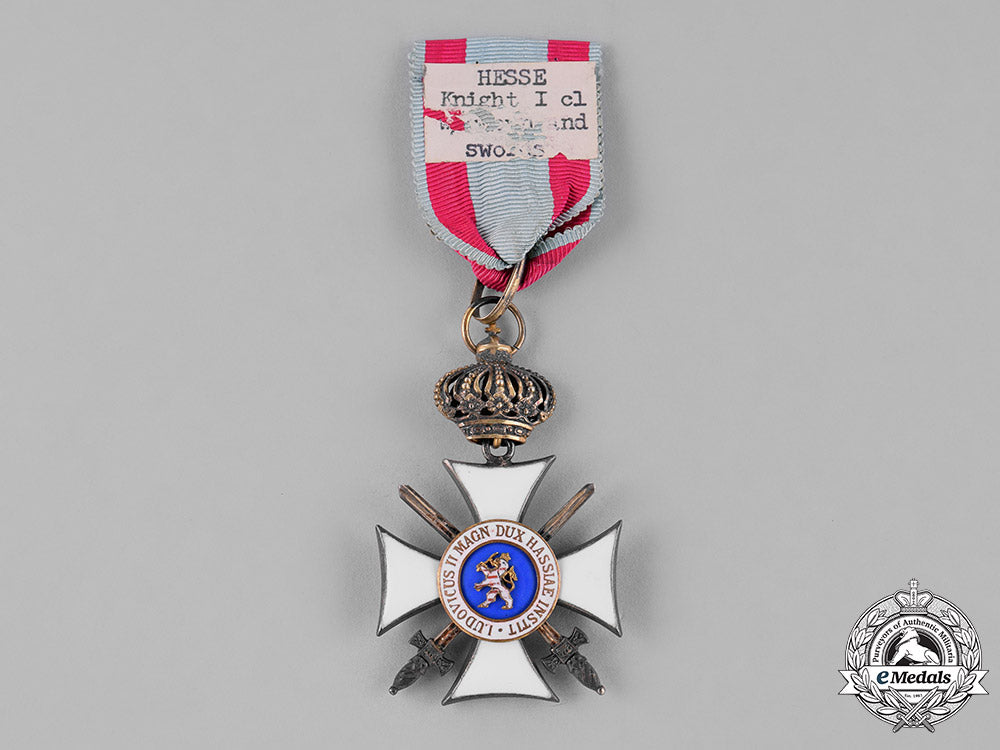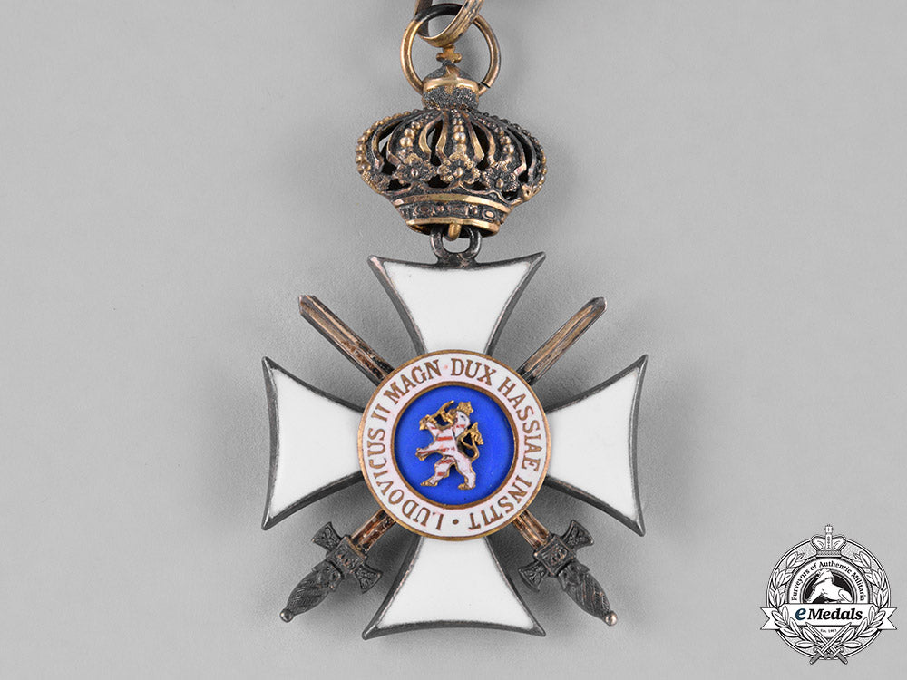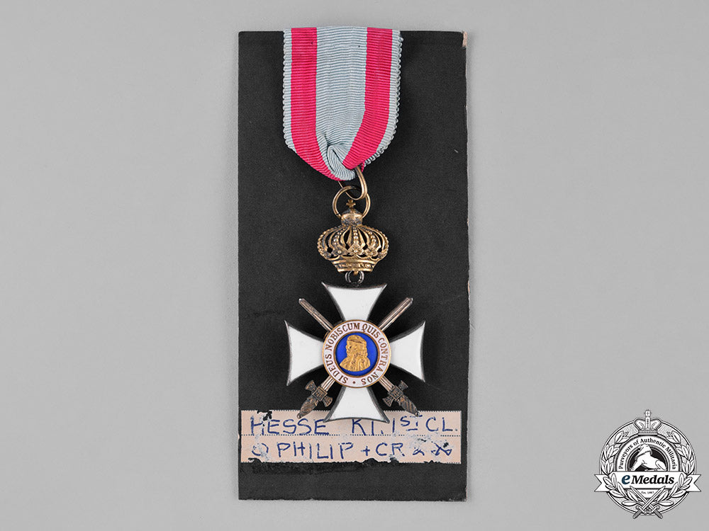 (Orden Philipps den Großmütigen, Ritterkreuz 1. Klasse, mit Schwertern und Krone). Issued 1881-1918. A silver cross pattee with white enameled arms, with crossed swords between the arms of the cross; the obverse with a central light blue enameled medallion depicting the rightward facing outline of Philipp in bronze gilt, surrounded by a ring of white enamels, inscribed “Si Deus Nobiscum Quis Contra Nos” (Latin - If God is with us, who is against us); the reverse with an enameled Hessian lion on a central blue enameled medallion, surrounded by a ring of white enamels, inscribed by the name and title of King Ludwig; on a swivel crown and loop for suspension from its period original ribbon; measuring 36.52 mm (w) x 36.81 mm (h); weighing 23.9 grams; in overall extremely fine condition.