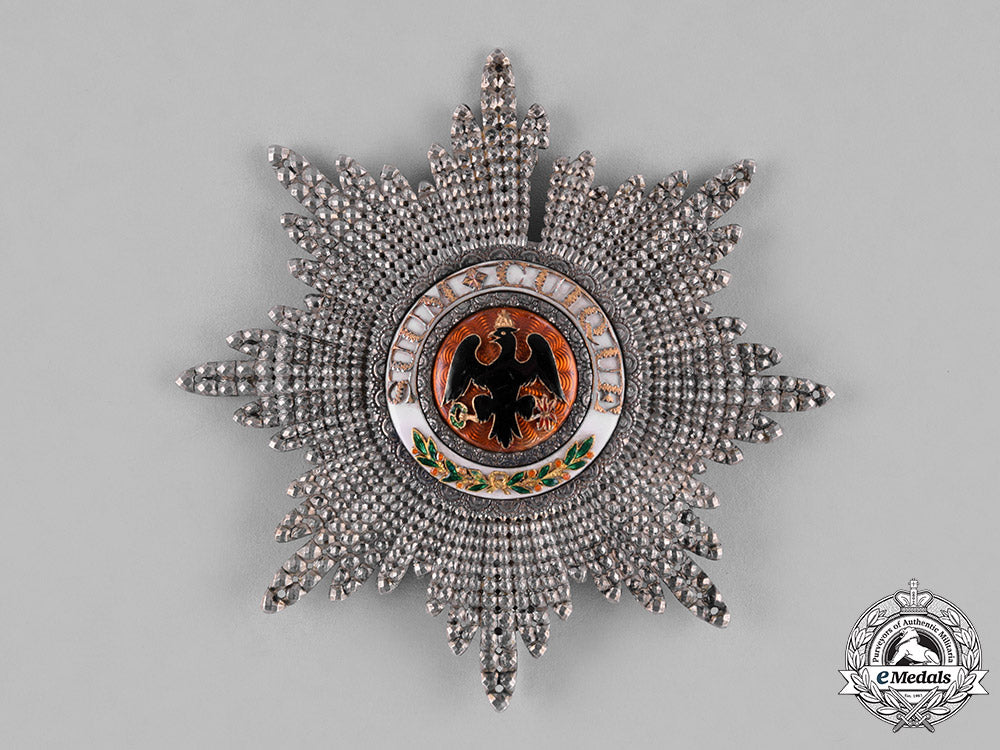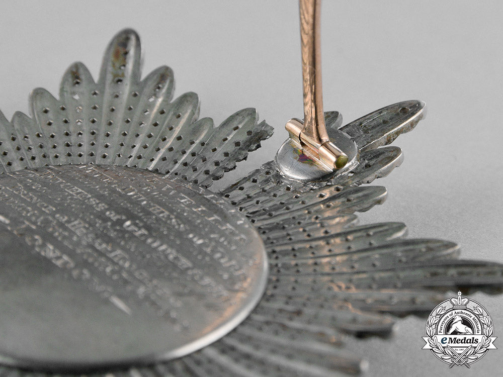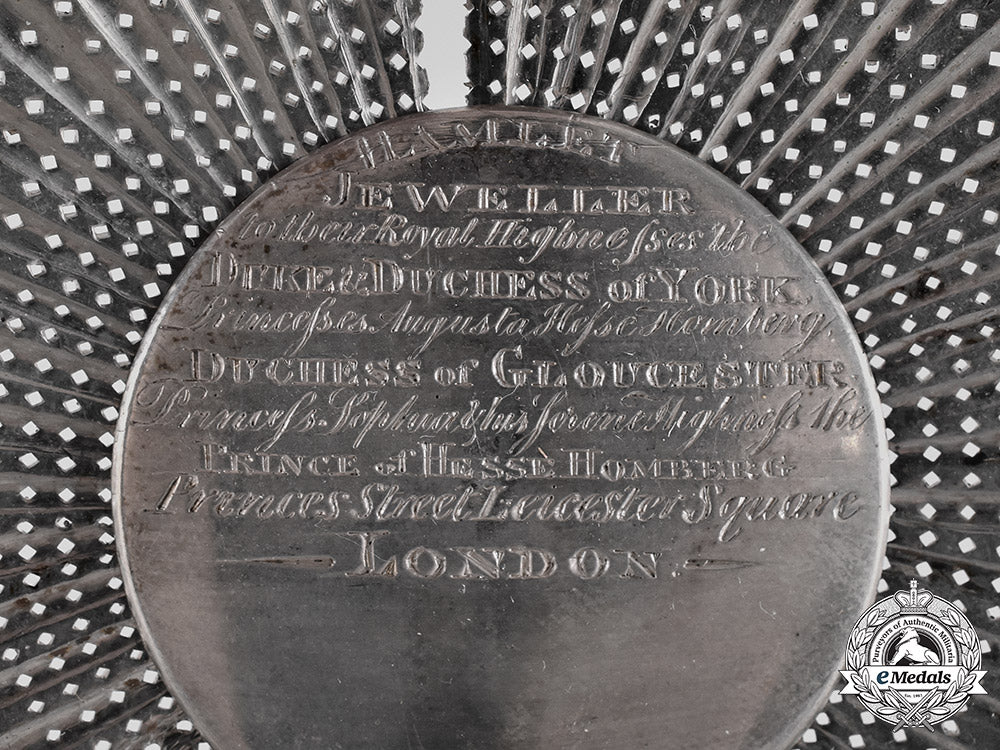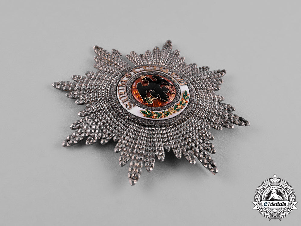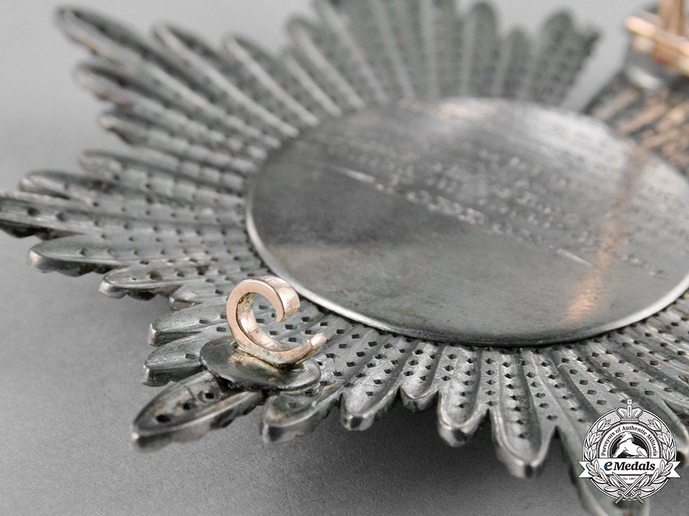 (Hohe Orden vom Schwarzen Adler Bruststern zum Kreuz des Orden). Instituted on 17.1.1701 by Duke Friedrich III of Brandenburg. Of characteristic Hamlet manufacture, consisting of an eight-pointed faceted multi-rayed silver star, the obverse with a dark orange enameled medallion bearing a black enameled eagle, surrounded by a broad ring of white enamels, inscribed “SUUM CUIQUE” (Each their own) in gilt lettering with a multi-coloured enameled partial laurel wreath at the base, the reverse plain, with a Gold vertical pinback, a barrel hinge, and a round wire catch, marked “Hamlet Jeweler to their Royal Highnesses the Duke & Duchess of York, Princesses Augusta Hesse Homberg, Duchess of Gloucester, Princess Sophia & his ... Highness the Prince of Hesse Homberg Princes Street Leicester Square - London -” on the reverse, measuring 79.50 mm (w) x 80.10 mm (h), one of the silver rays missing, in overall better than very fine condition.