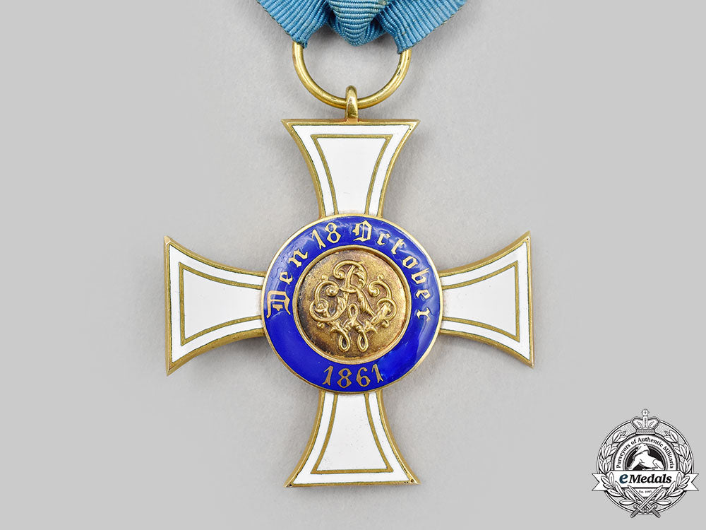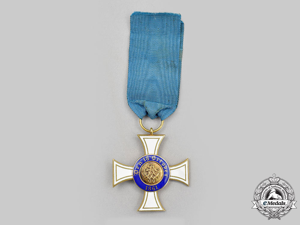 (Königlicher Kronen-Orden Kreuz III. Klasse in Gold). Instituted 18 October 1861 by King Wilhelm I. (1869-1918 issue). Constructed of Gold with multi-coloured enamels, consisting of a Cross Pattée with white enameled arms trimmed in with gilt borders, the obverse bearing a central Gold medallion overlaid by a raised crown, set within a ring of blue enamel bearing a gilt inscription of “GOTT MIT UNS” (“GOD WITH US”) and arabesques, the reverse bearing a central Gold medallion overlaid by a raised monogram of King Wilhelm I, within a ring of blue enamel bearing a gilt institution date of “DEN 18 OCTOBER 1861”, the twelve o’clock arm topped by an integral loop and suspension ring retaining a period original ribbon, unmarked, measuring 41.86 mm (w) x 45.60 mm (h), weighing 12.0 grams, with minor flecking of enamels evident, in extremely fine condition.