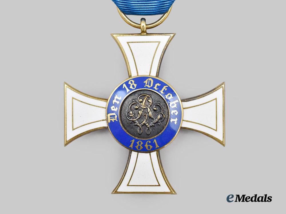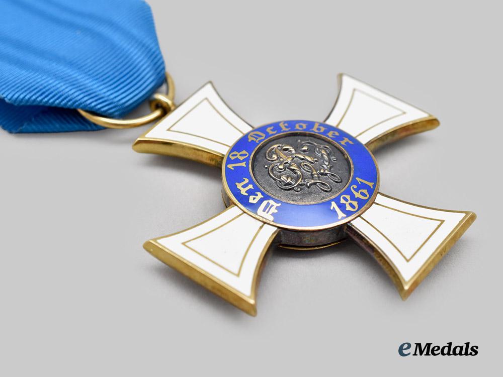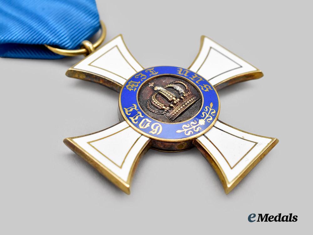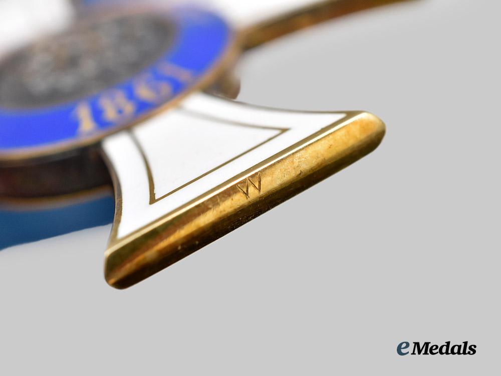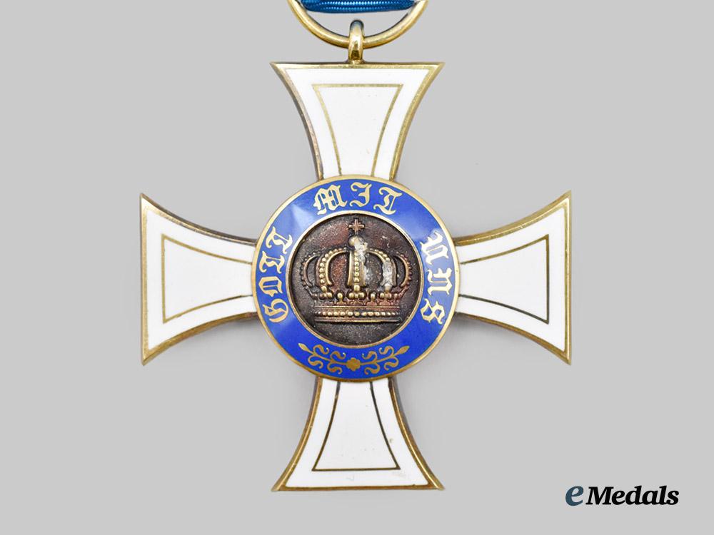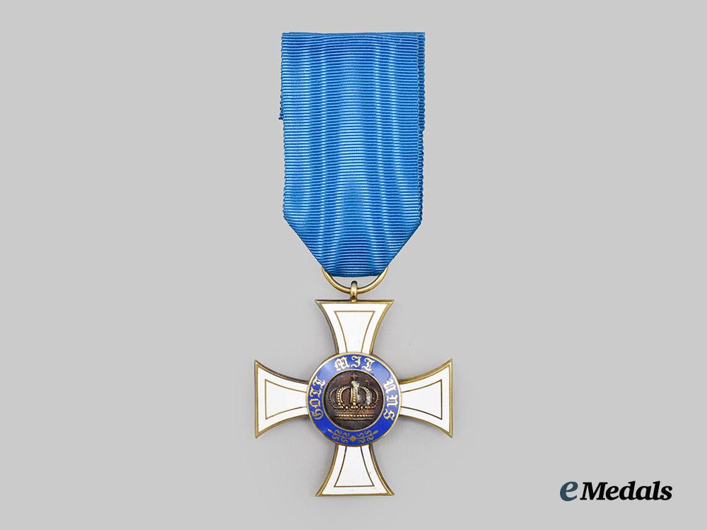 (Königlicher Kronen-Orden). Instituted October 18th, 1861. (Type II - 1867-1918). c. 1916. In Gold, consisting of a Cross Pattée with white enamelled arms, the obverse bearing a central medallion overlaid by a raised crown, situated within a blue enamelled ring bearing the inscription “GOTT MIT UNS” (“GOD WITH US”) and arabesques, the reverse bearing a central medallion overlaid by a raised monogram of King Wilhelm I, situated within a blue enamelled ring bearing the institution date of “DEN 18 OCTOBER 1861”, the twelve o’clock arm topped by an integral loop with a suspension ring retaining a replacement blue silk ribbon, the bottom of the 6 o’clock arm marked “W” for manufacture by Wagner & Sohn, measuring 42.7 mm (w) x 45.8 mm (h - inclusive of suspension ring), weighs 12.63 grams, enamels intact, in better than extremely fine condition.