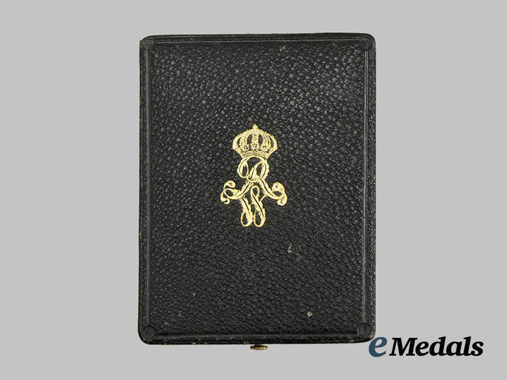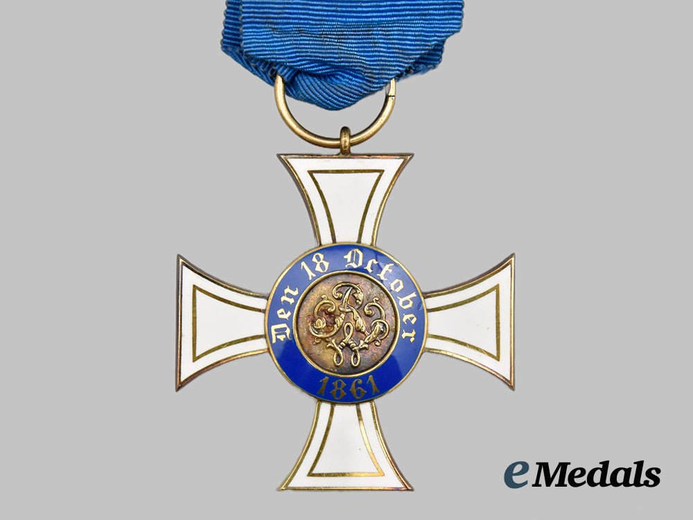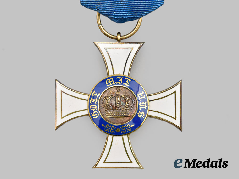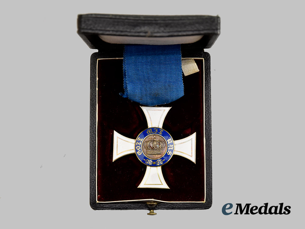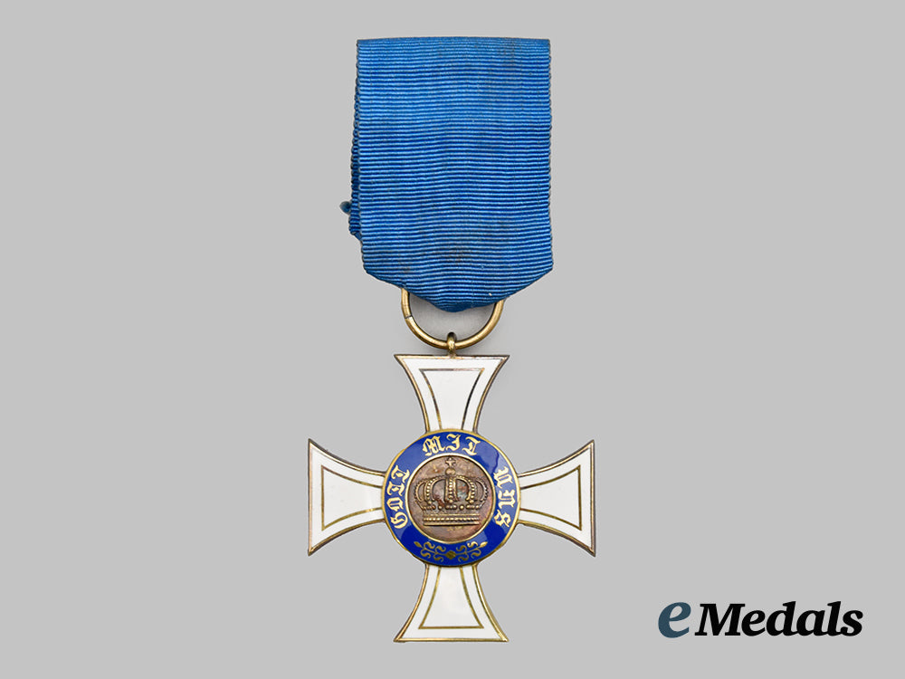 (Königlicher Kronen-Orden, Kreuz III. Klasse in Gold). Instituted 18 October 1861 by King Wilhelm I. (1869-1916 issue). Constructed of 14k Gold with multi-coloured enamels, consisting of a Cross Pattée with white enameled arms trimmed with gilded borders, the obverse bearing a central Gold medallion overlaid by a raised crown, situated within a blue enameled ring bearing a gilt inscription of “GOTT MIT UNS” (“GOD WITH US”) with arabesques, the reverse bearing a central Gold medallion overlaid by a raised monogram of King Wilhelm I, situated within a blue enameled ring bearing a gilt institution date of “DEN 18 OCTOBER 1861”, the twelve o’clock arm topped by an integral loop and suspension ring retaining a period original ribbon, the six o’clock arm maker marked with the logo of Neuhaus & Sohn, Berlin, measuring 42.95 mm (w) x 46.27 mm (h), weighing 11.9 grams, accompanied by its original presentation case, constructed of a wooden frame with a faux black leather exterior liner, the lid bearing a gilt monogram of King Wilhelm I, the interior with a padded white satin lid liner and depressed maroon velvet medal bed, the latter retaining a ribbon for retraction, closing with a functional metal spring catch with exterior stud release, unmarked, measuring 62 mm (w) x 82 mm (l) x 25 mm (h), a high-quality example in extremely fine condition.