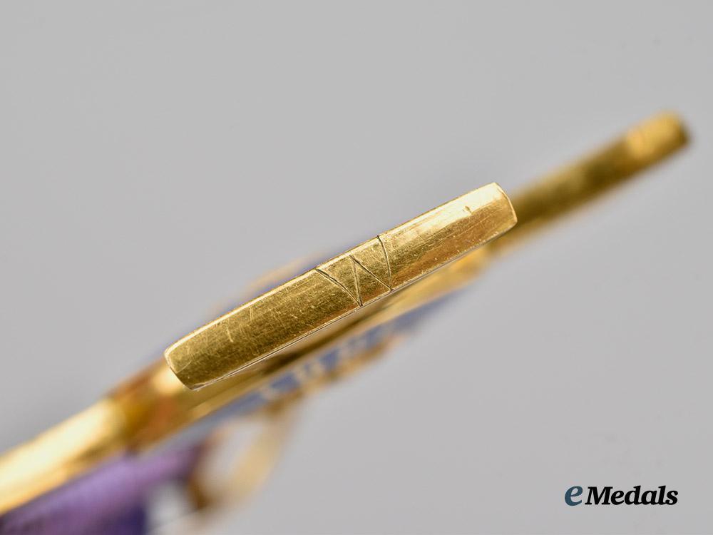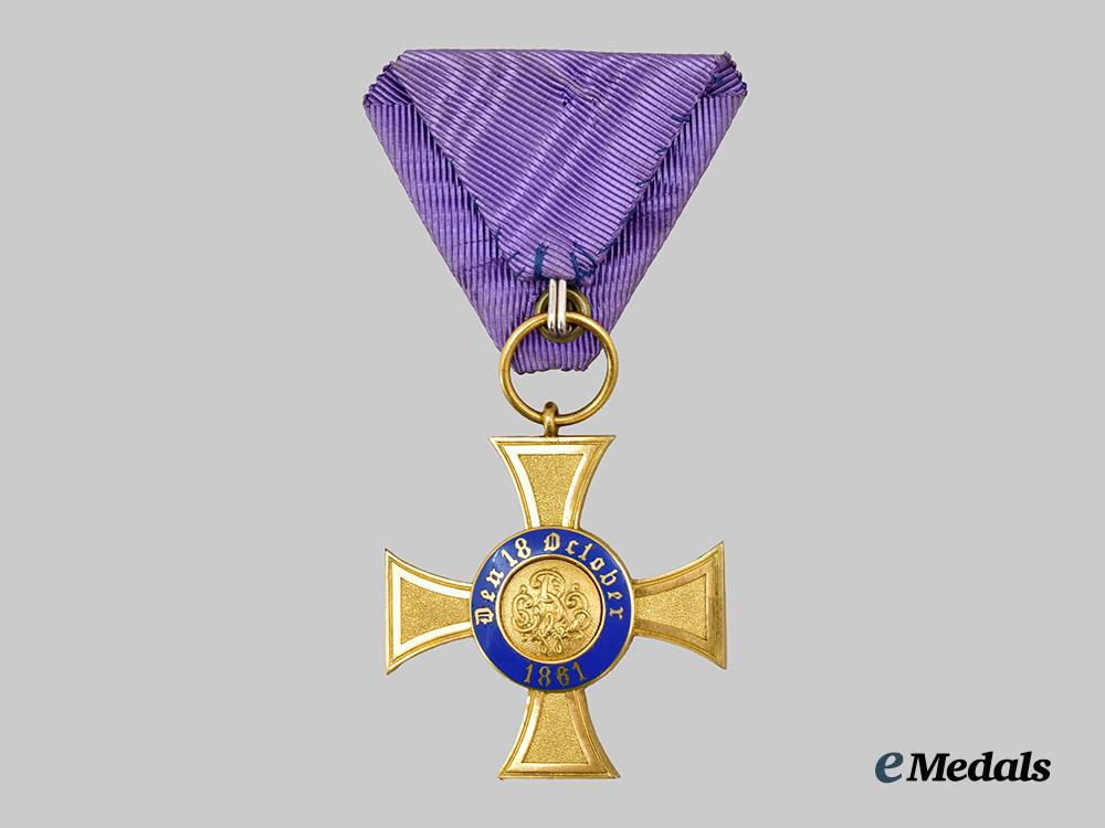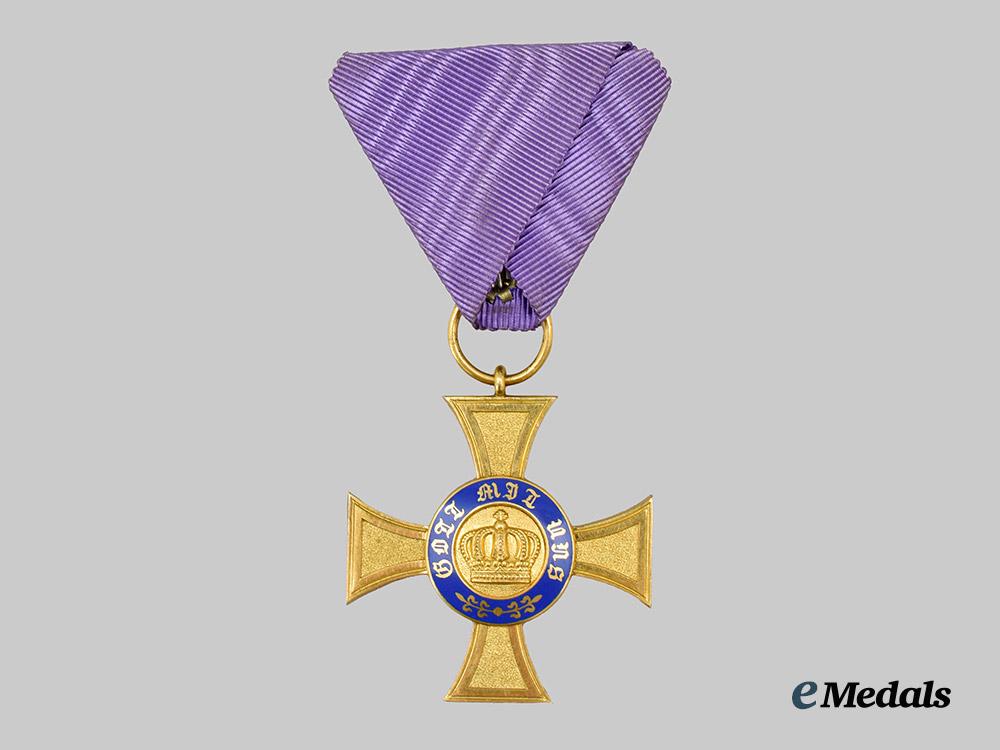 (Königlicher Kronen-Orden Kreuz IV. Klasse). Instituted 18 October 1861 by King Wilhelm I. (1869-1918 issue). Constructed of gilded alloy with enamels, on loop for suspension from a period mis-matched tri-fold ribbon, consisting of a Cross Pattée with pebbled arms trimmed with raised borders, the obverse bearing a central raised crown, situated within a circular blue enameled ring bearing a gilt inscription of “GOTT MIS UNS” (“GOD WITH US”) with arabesques, the reverse bearing a central raised monogram of King Wilhelm I, situate within a circular blue enameled ring bearing a gilt institution date of “DEN 18 OCTOBER 1861”, the six o’clock arm maker marked with the logo of Johann Wagner & Sohn, Berlin, measuring 43.20 mm (w) x 47.54 mm (h), weighing 15.4 grams, in extremely fine condition.