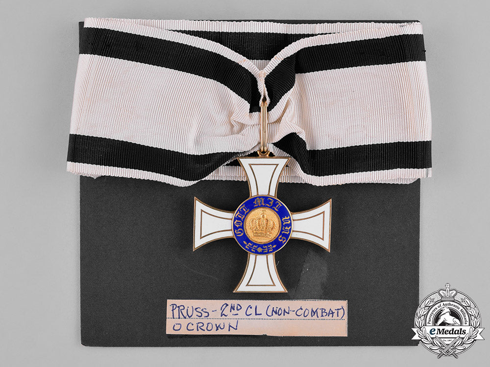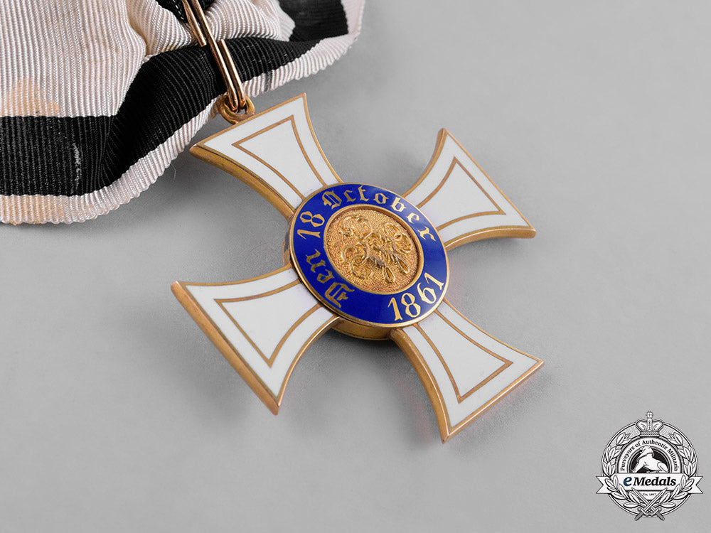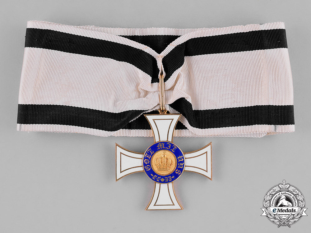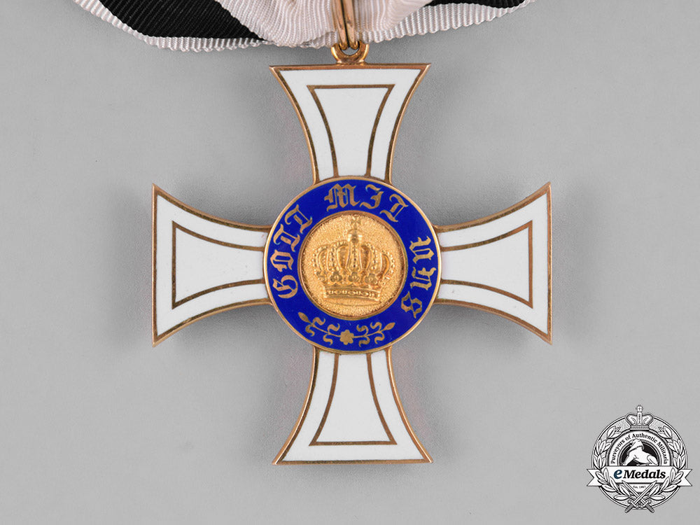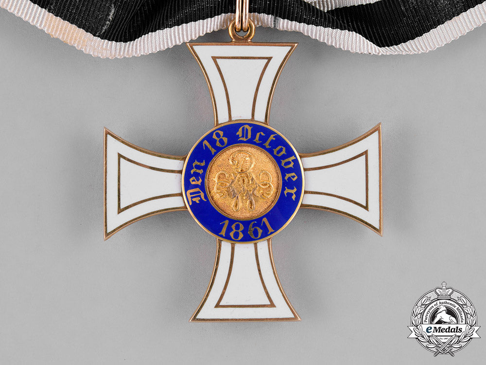 (Königliche Kronen-Orden II Klasse). Instituted on October 18, 1861 by King Wilhelm I. (Issued 1867-1918). A Gold cross pattee with white enameled arms, the obverse with a circular central medallion in Gold depicting the Royal Prussian crown, surrounded by a light blue enameled ring, inscribed “Gott Mit Uns" (German- God with Us) in Gold lettering, the reverse with a circular central medallion depicting the royal cipher of King William I in Gold, surrounded by a light blue enameled ring, inscribed “Den 18 October 1861) (German - the 18th of October 1861) also in Gold, on a period non-combatant’s ribbon, measuring 51.10 mm (w) x 51.09 mm (h), weighing 29.4 grams with its ribbon, in extremely fine condition.