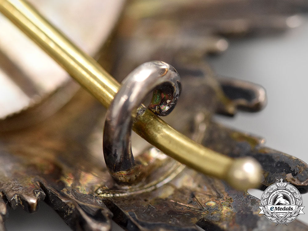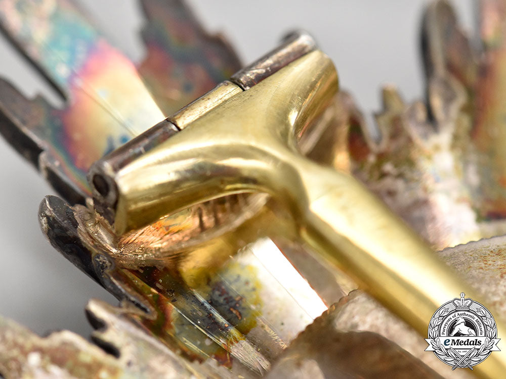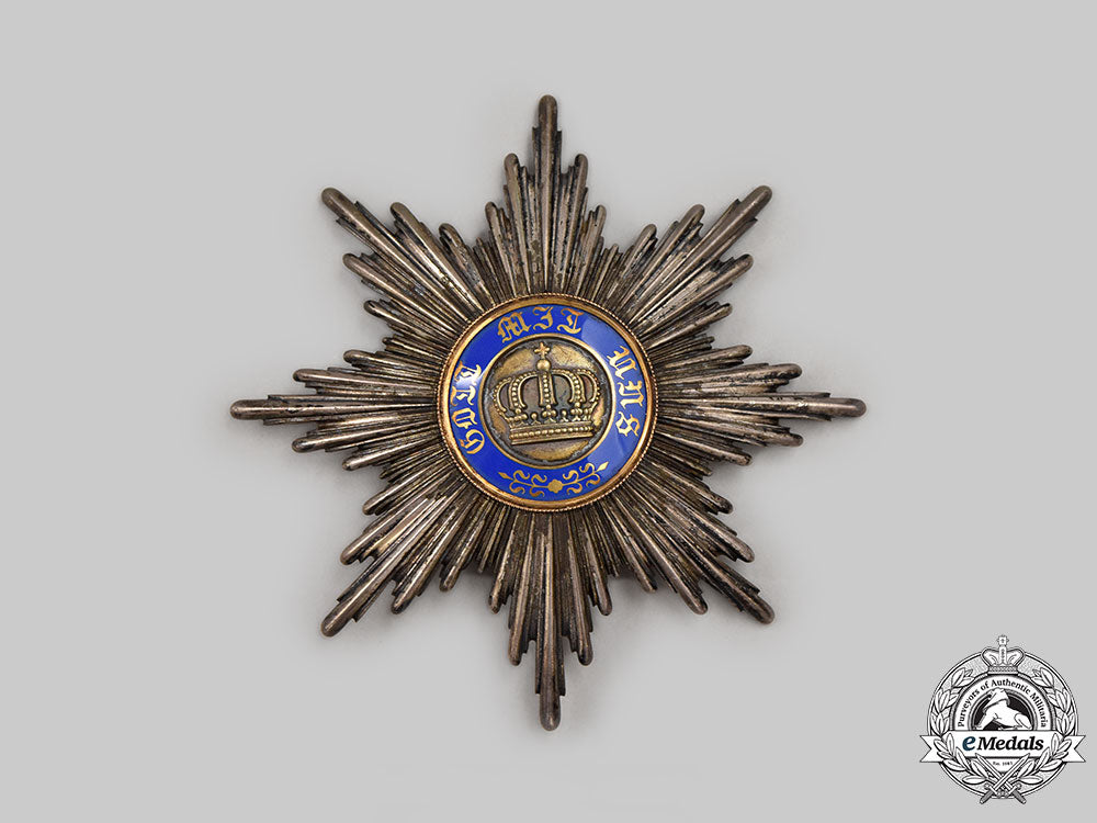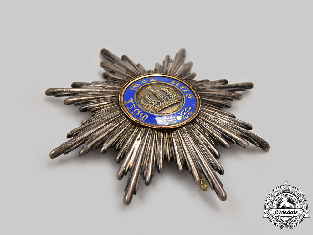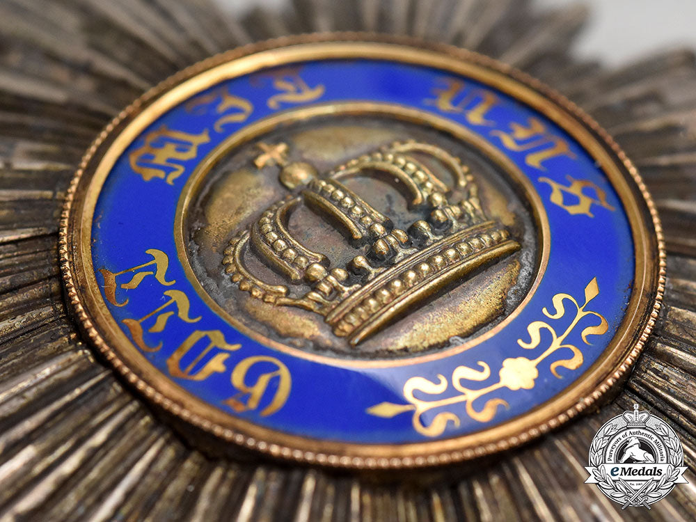 Instituted by King Wilhelm I on January 18, 1861. Type II (1867-1918). Civil Division. In Silver, an eight point star featuring clusters of smooth rays, the central medallion in Gold presents a large central crown, surrounded by a blue enamel ring inscribed GOT MIT UNS (God by with us) ringed with a thin Gold exterior, the reverse bears a single pin assembly, marked W (for Wagner, Berlin) below the catch at 6 o’clock, measures 91mm (w) x 91.5mm (h), weighs 72.4 grams, enamels intact, dark patina, a lovely star in extremely fine condition.