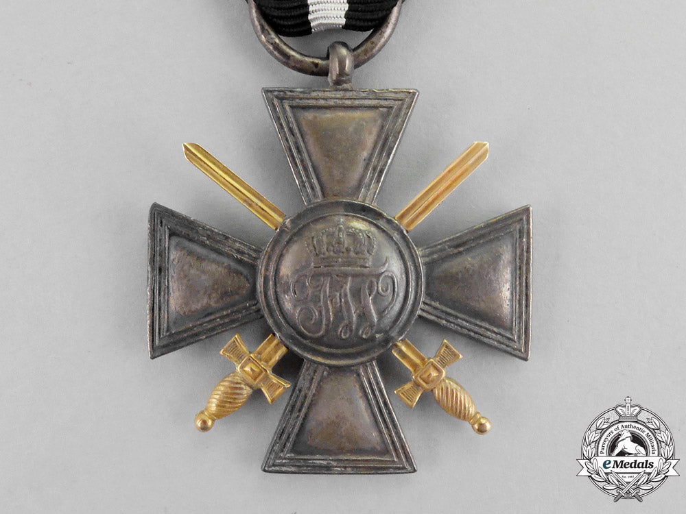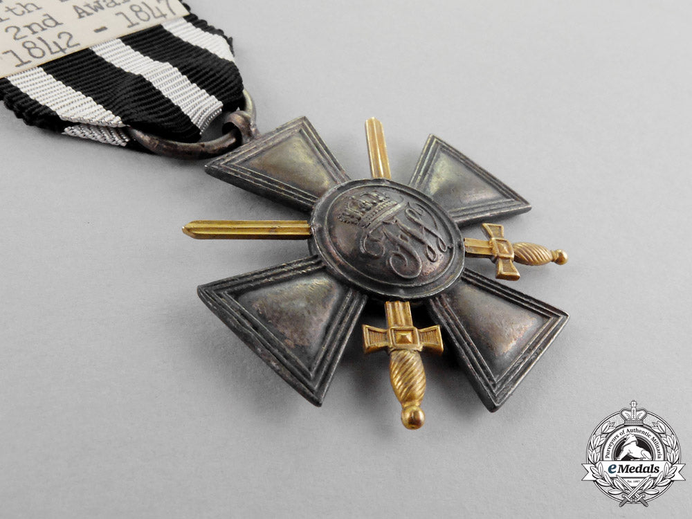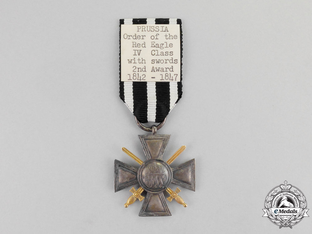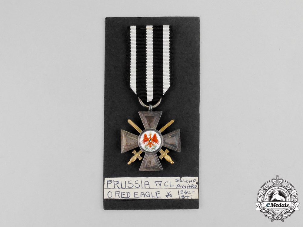 1854-1879 Issue. (Preußische Rote Adlerorden IV. Klasse mit Schwertern) with screwed-in gold Swords; silver cross pattée with smooth arms; the obverse with a circular enameled medallion depicting an enameled Brandenburg crowned eagle; the reverse with the crowned cipher of King Friedrich Wilhelm III; an unmarked example; measuring 37.63 mm (w) x 38.16 mm (h); weighing 14.1 grams; on a laterally-pierced loop and a ring for suspension; suspended from a replacement ribbon; with a paper tag attached reading “Prussia Order of the Red Eagle IV Class with swords 2nd award 1842-1847” on the reverse; with light contact marks but very fine.