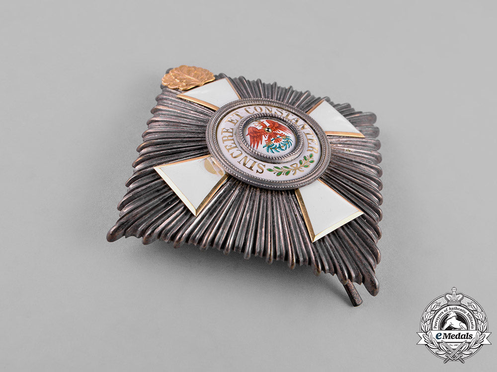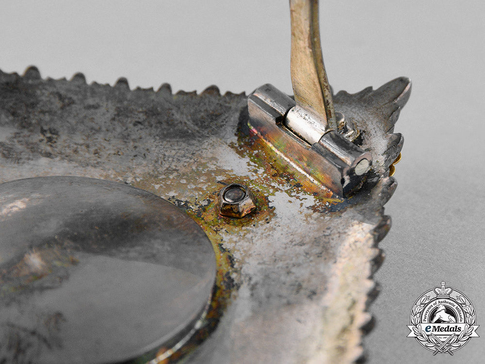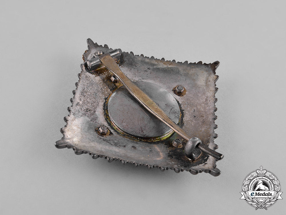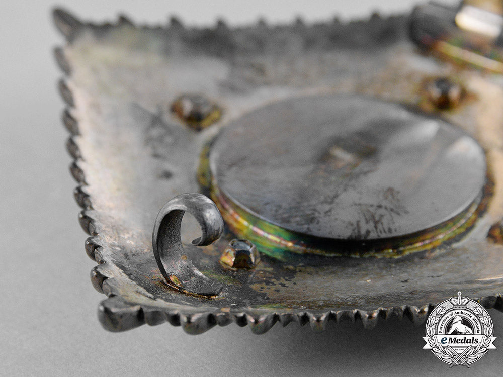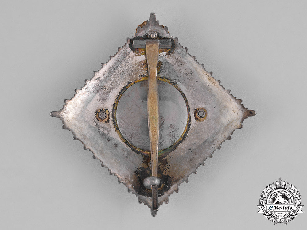 (Preußische Rote Adlerorden Bruststern zur II. Klasse, mit Eichenlaub). Instituted on 12.6.1792 by King Friedrich Wilhelm II. (Issued 1792-1918). Constructed of a four-pointed silver rayed star, the obverse with a Gold cross pattee with white enameled arms, with a circular white enameled medallion in the center depicting an enameled red crowned eagle, surrounded by a silver ribbed ring, a broad white enameled ring inscribed “SINCERE ET CONSTANTER” (Sincere and Persistent) in Gold lettering, also surrounded by a silver ribbed ring, to the top of the twelve o’clock arm is a Gold oak leaf, the reverse plain, with a vertical pinback, and a functional hinge/catch assembly, with four rivets visible on the reverse, measuring 82.20 mm (w) x 81.84 mm (h), weighing 62.6 grams, with enamel loss on the nine o’clock arm, toned silver, in overall good/fine condition.