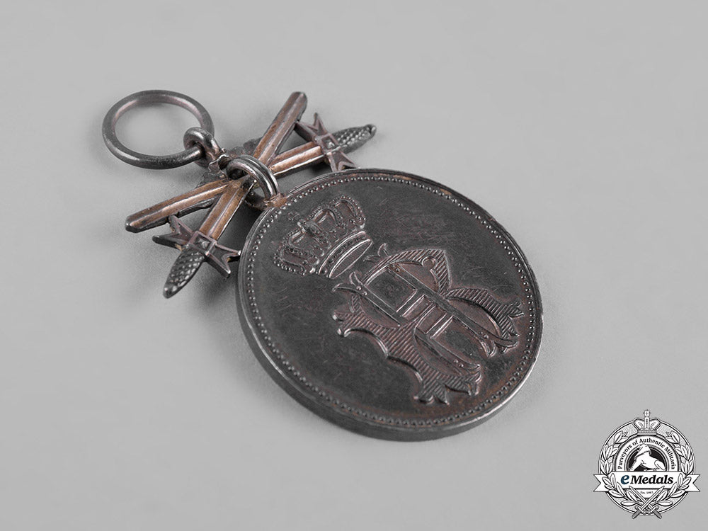 (Silberne Verdienstmedaille mit Schwertern zum Fürstrich Reußischen Ehrenkreuz). A round silver medal, awarded to Lance corporals and Privates. the obverse depicting the crowned royal monogram of Heinrich Reuss. Awarded to Lance corporals and Privates. The reverse inscribed FÜR VERDIENST (German - For Merit) within a laurel wreath, suspended from a loop for suspension from a set of swiveling swords, measuring 32.79 mm in diameter; weighing 19.5 grams, on loop for suspension from period original ribbon, and in very fine condition.