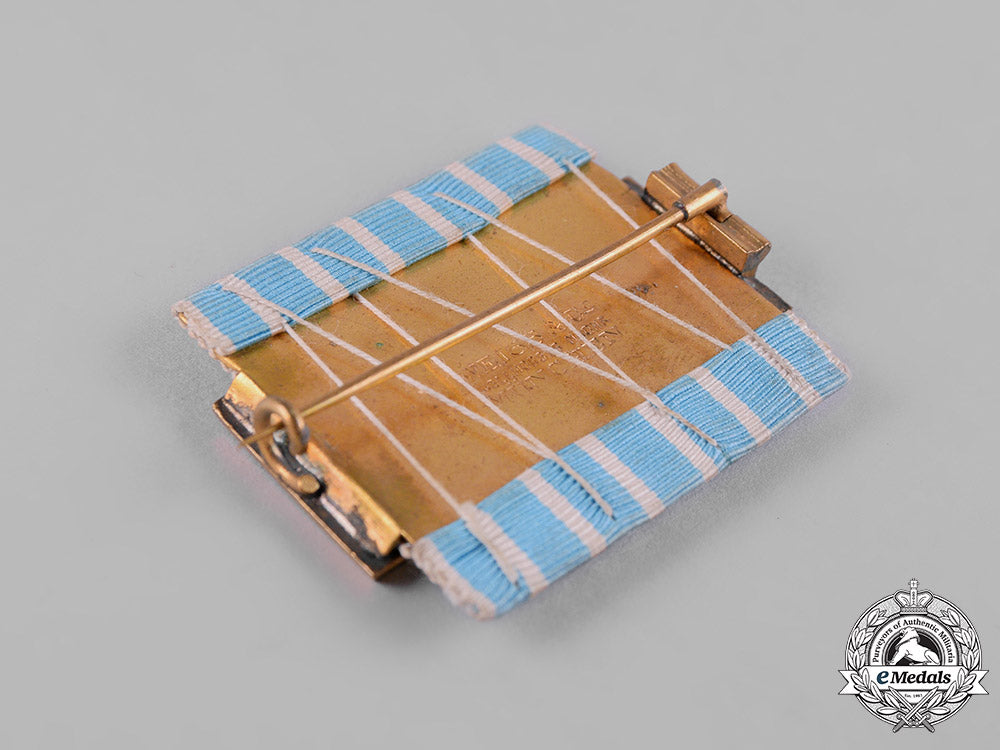 (Ehrenzeichen für Mitglieder der Feuerwehren nach 25 jähriger Dienstzeit). Constructed of gilded bronze, horizontal pinback, affixed to a gilded bronze backer with a period original ribbon, the reverse maker marked “WEISS & CO., MÜNCHEN”, measuring 48 mm (w) x 36 mm (h), in extremely fine condition.