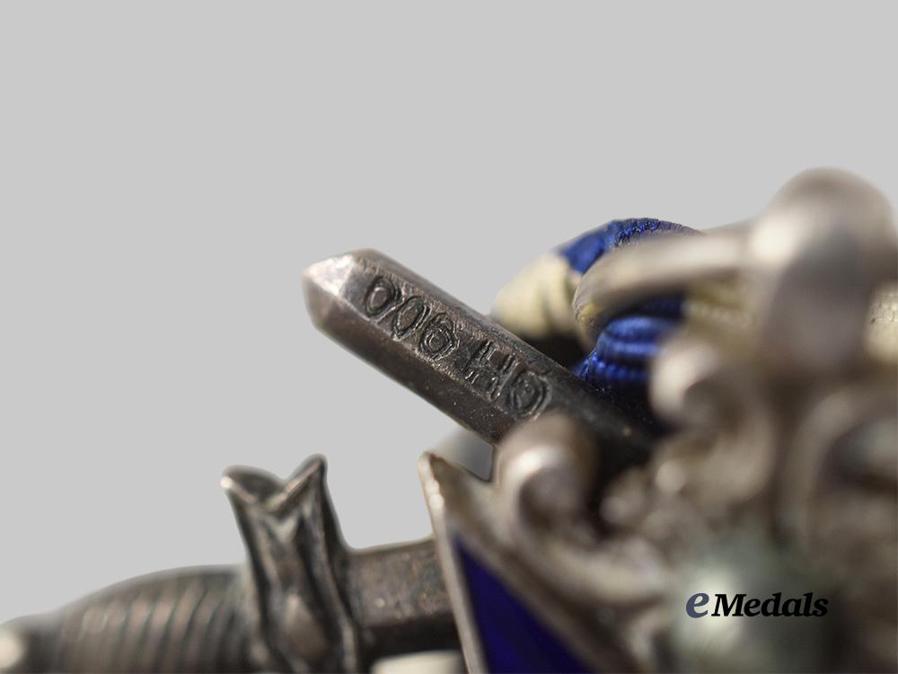 (Militär-Verdienstorden Kreuz IV. Klasse mit Krone und Schwertern). Instituted 19 July 1866 by King Ludwig II. (1905-1918 issue). Constructed of silver with Gold and multi-coloured enamels, consisting of a Maltese Cross with blue enameled arms joined through the quadrants by stylized flames, the obverse overlaid by a central Gold medallion featuring a black enameled centrepiece, in turn bearing a raised Gold monogram of King Ludwig II, situated within a stylized white enameled belt and buckle, bearing a gilt inscription of “MERENTI” (“MERIT”) with arabesques, the twelve o’clock arm riveted with a crossed sword clasp, the reverse overlaid by a central Gold medallion featuring a black enameled centrepiece, in turn bearing a raised Gold Bavarian lion rampant, situated within a stylized white enameled belt and buckle bearing a gilt institution date of “1866” with arabesques, retains a period original ribbon, the reverse of a sword stamped with silver content numbers of “900” and “GH” denoting manufacture by Gebruder Hemmerle, measuring 41.3 mm (w) x 49.8 mm (h), weighing 27.94 grams with ribbon, demonstrating minor flecking to the enamels, a fine-quality wartime-produced example in extremely fine condition.