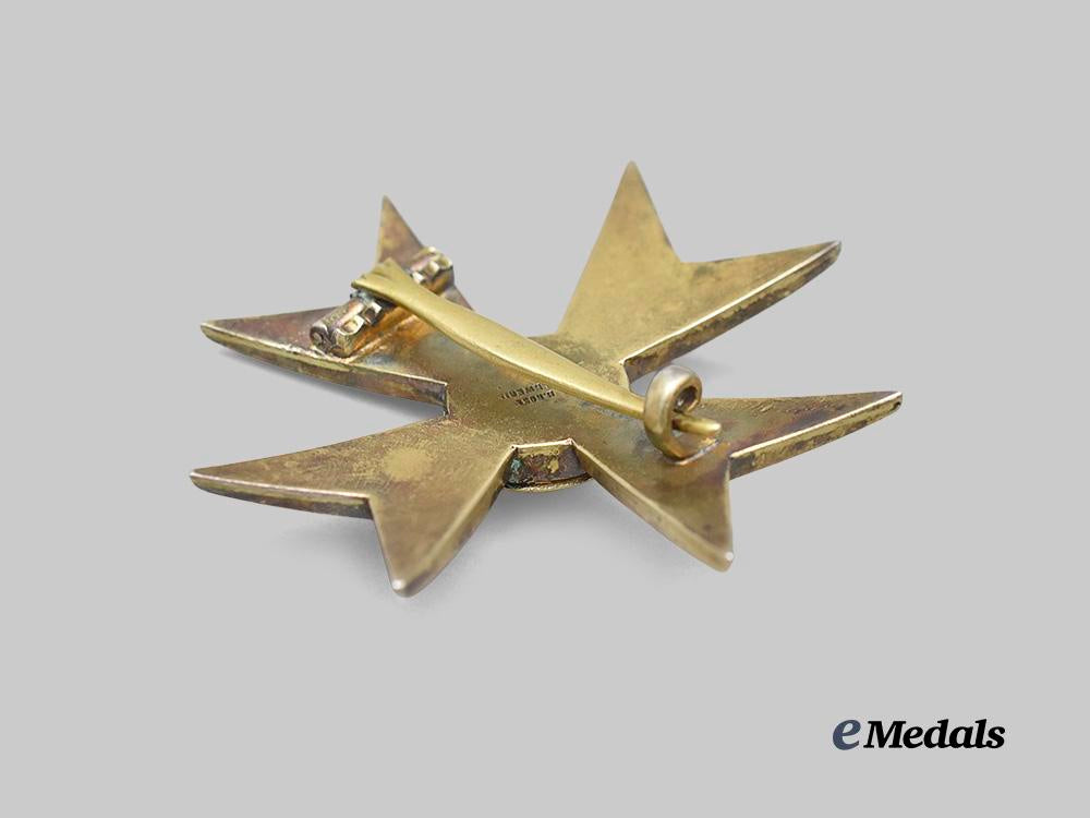 (Greifenorden Ehrenkreuz). Instituted 15 September 1884 by Grand Duke Friedrich Franz IV. (1884-1918 issue). Constructed of gilded silver with enamels, consisting of a vaulted Maltese Cross, the obverse with red enameled arms displaying pronounced hatching, overlaid by a central pebbled and gilt medallion bearing a raised Griffin, in turn situated within a gilded circular ring, the reverse with a wide barrel hinge and tapering vertical pinback meeting a rounded catch, maker marked “H. ROSE, SCHWERIN” for the noted jeweller Heinrich Rose, measuring 54.49 mm (w) x 54.04 mm (h), weighing 27.3 grams, in extremely fine condition.