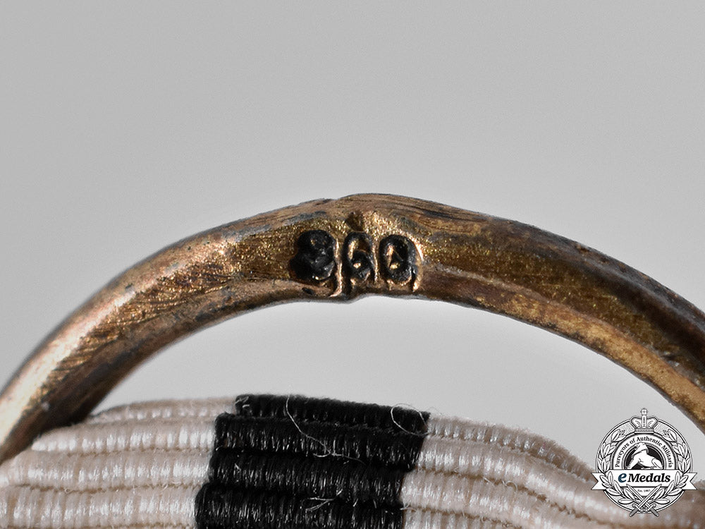 (Hausorden of Hohenzollern, Adler der Ritter). Issued 1851-1918. Constructed of silver gilt, as well as black, white, and blue enamels; in the shape of an eagle, with a ring of blue enamels surrounding the head of the eagle, inscribed “Vom Fels zum Meer” (German - From the boulder to the ocean) in gilt capital lettering; on a loop for suspension from its period original ribbon; measuring 32.30 mm (w) x 34.53 mm (h); weighing 11.2 grams; in virtually mint condition.