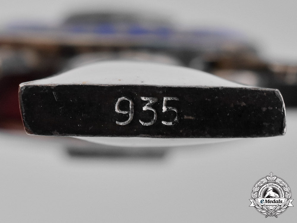 (Albrechtsorden Ritterkreuz 2. Klasse, mit Schwertern). Issued 1890-1918. A Latin cross constructed of silver with white enameled arms; the obverse with a central white enameled medallion bearing the leftward facing bust of Herzog Albrecht, surrounded by a blue enameled ring inscribed “Albertus Animous” (Latin - Albert the Merciful), along with arabesques towards the bottom of the enameled ring; the reverse with a crowned royal coat of arms, surrounded by a blue enameled ring, dated “1850”, along with arabesques; missing its loop and ribbon for suspension; marked “935” on the bottom of the six o’clock arm of the cross; measuring 34.43 mm (w) x 45.00 mm (h); weighing 19.3 grams; in overall better than very fine condition.