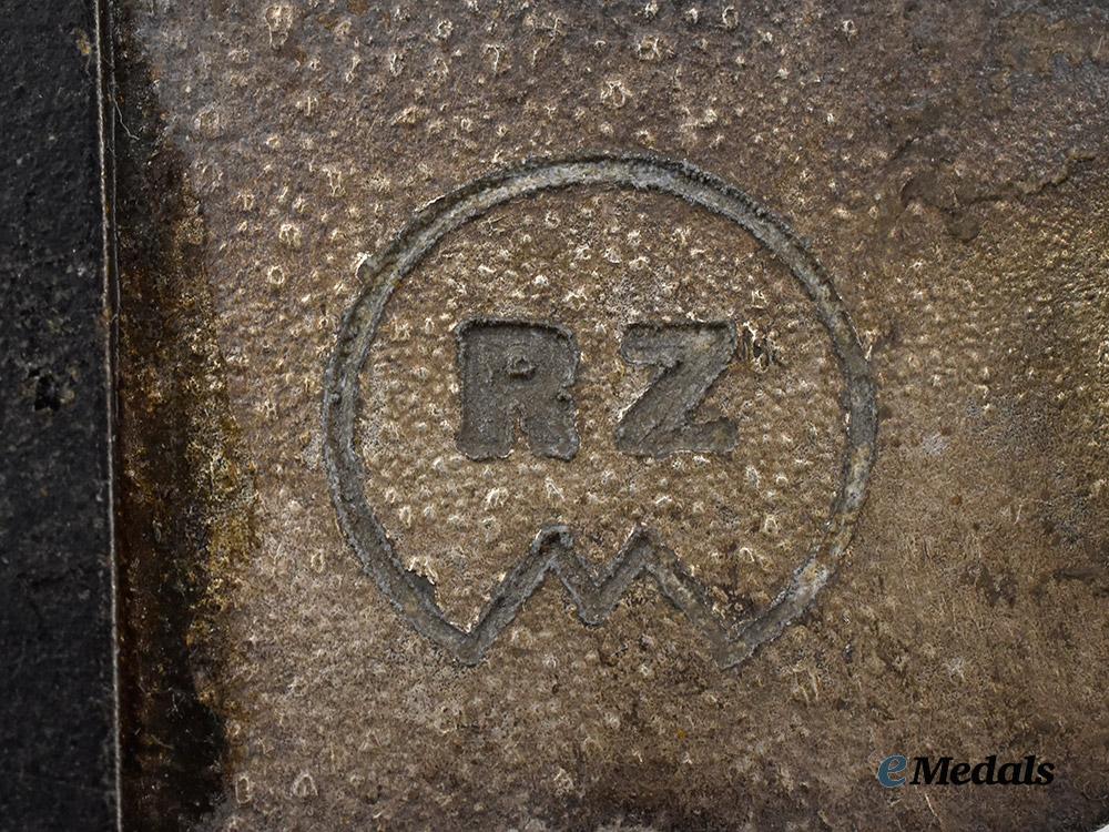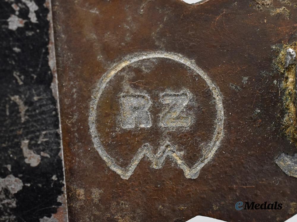 (Nahkampfspange). Instituted November 25th, 1942. Constructed of gilded, silvered, and bronzed (respectively) feinzink, consisting of a central square oak leaf wreath, topped by a Wehrmacht eagle clutching a mobile swastika, overlaid by a crossed bayonet and stick grenade, in turn situated above a magnetic metal backplate, flanked on each side by four rays and four oak leaves with two acorns, the reverse with a horizontal pinback, falsely marked “RZM”, measuring approximately 97 mm (w) x 26 mm (l), in near mint condition.