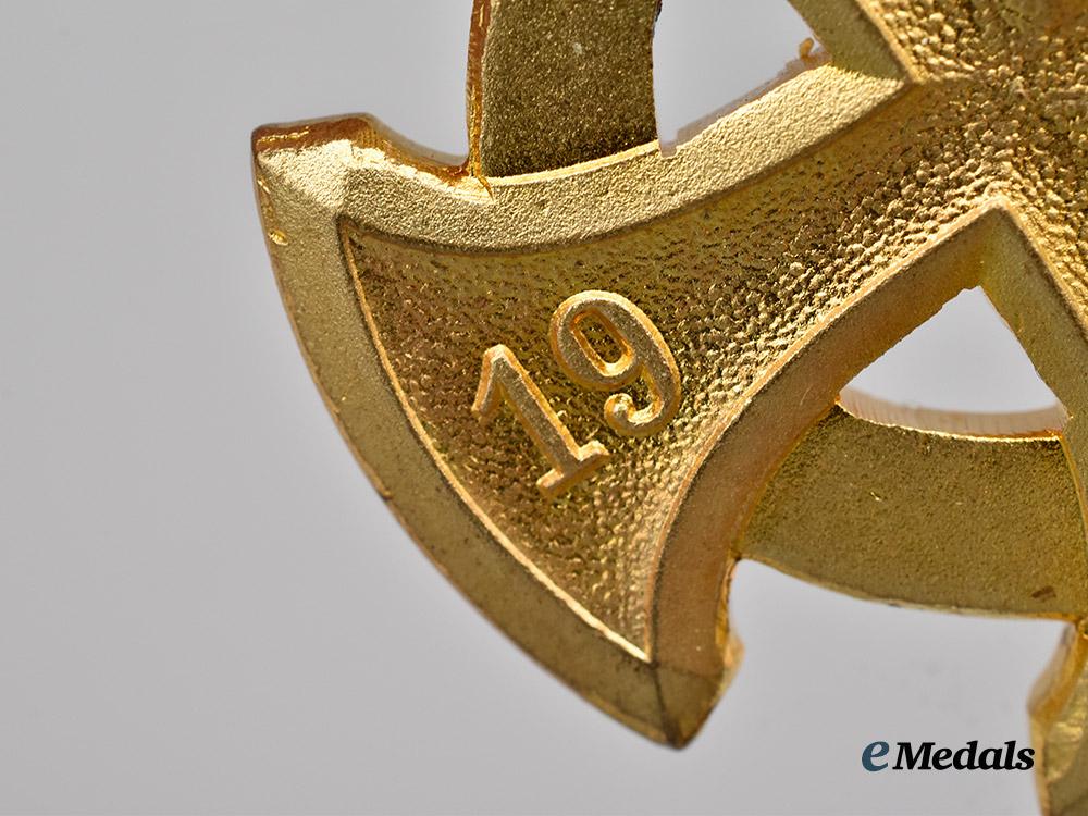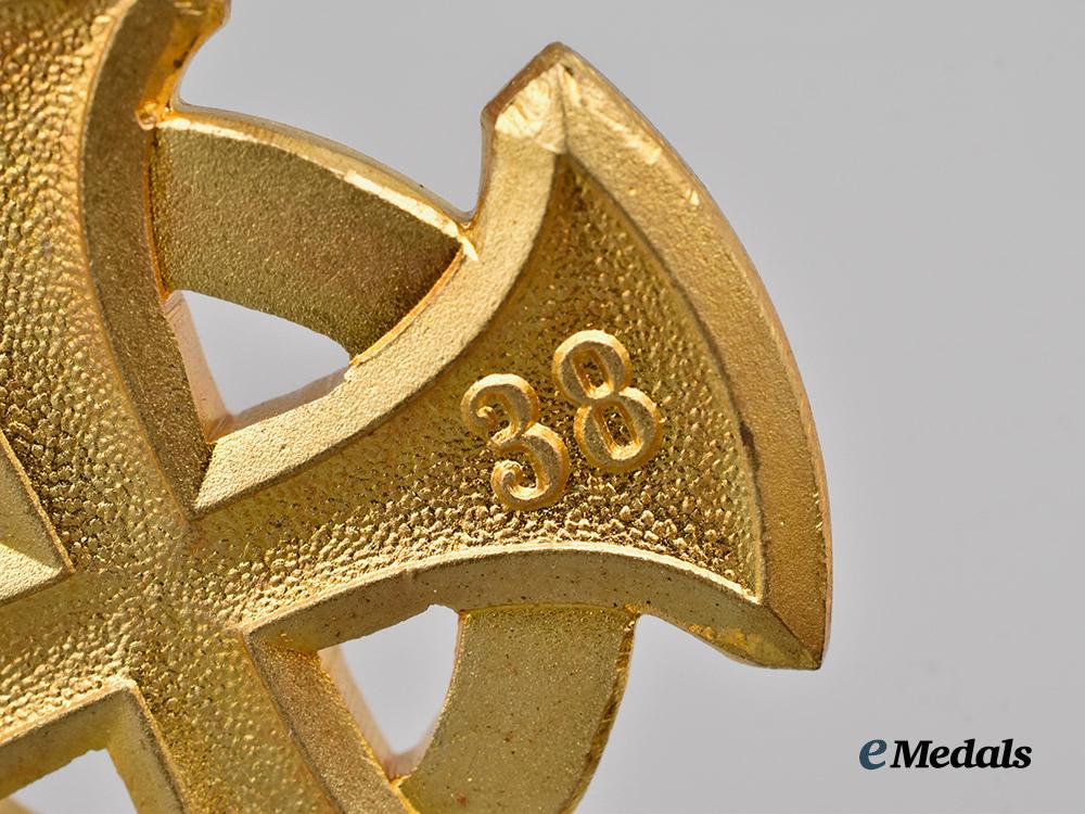 2. An Air Defence Honour Decoration, I Class, constructed of gilded bronze, on loop for suspension from its original ribbon, consisting of a Cross Pattée with pebbled arms, the obverse overlaid by a circular ring bearing an inscription of “FÜR VERDIENSTE IM LUFTSCHUTZ” (“FOR MERIT IN AIR DEFENCE”), the reverse bearing a date of “1938”, unmarked, measuring 39.57 mm (w) x 42.81 mm (h), in extremely fine condition.