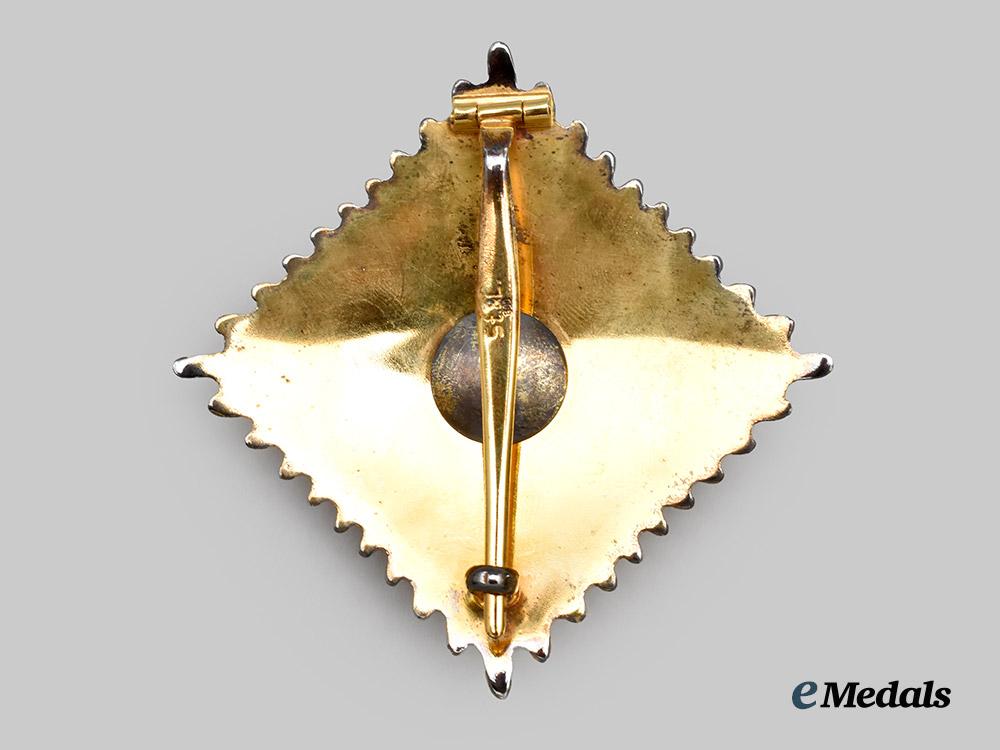 2. A breast star, constructed of gilded silver with multi-coloured enamels, the obverse consisting of a subtly vaulted four-pointed radiant starburst, overlaid by a central Cross Pattée with narrow and red enameled arms, in turn bearing a Federal Republic-style German national eagle executed in black enamel with gilded highlights, the reverse with a barrel hinge and tapering vertical pinback meeting a rounded catch, the pinback maker marked with the logo of Steinhauer & Lück, Lüdenscheid, with a silver content number of “800”, measuring 79.58 mm (w) x 79.61 mm (h), weighing 76.4 grams, demonstrating minor loss of gilt finish throughout the base metal, in extremely fine condition.