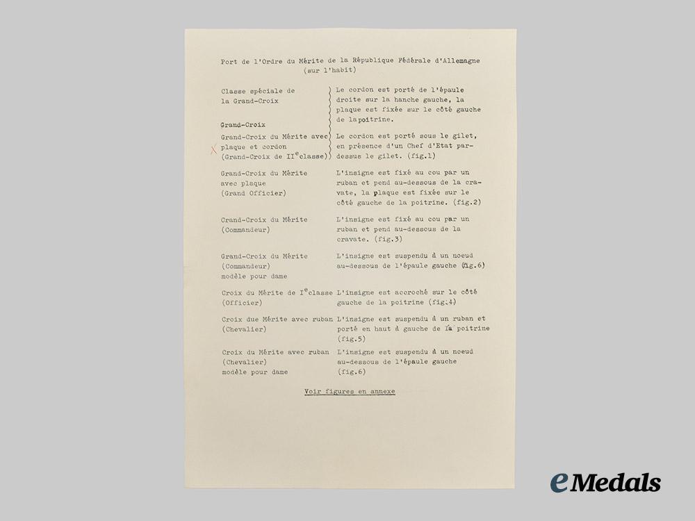 4. A presentation case, constructed of a wooden frame with a faux dark blue leather exterior liner, the lid bearing a gilt Federal Republic-style German national eagle, with a gilt border trimming the edges, the interior with a padded white satin lid liner similarly bearing a gilt eagle, with a two-piece fitted dark blue velvet medal bed featuring a hidden compartment for the accommodation of the sash ribbon, closing with two functional gilded brass snap buttons, unmarked, measuring 25 cm (w) x 35.5 cm (l) x 4.5 cm (h), notably retaining an original two-piece paper insert featuring a diagram for correct wear and French-language description of award grades, in extremely fine condition.