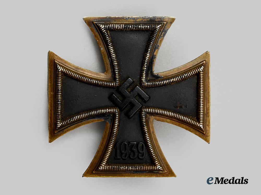 (Eisernes Kreuz 1939 I. Klasse). Re-instituted September 1st, 1939. (1939-1945 issue). Constructed of neusilber and iron, consisting of a Cross Pattée with a blackened magnetic iron core within a ribbed silver frame, the obverse with a central mobile swastika, the six o’clock arm with a reinstitution date of “1939”, the reverse with a block hinge and banjo-style pinback meeting a round wire catch, unmarked, measuring 44.3 mm (w) x 44.1 mm (l), weighing 20.40 grams, the obverse of the cross with a unique colour/patina on the frame, with attractive dark patina on the reverse, in better than fine condition.