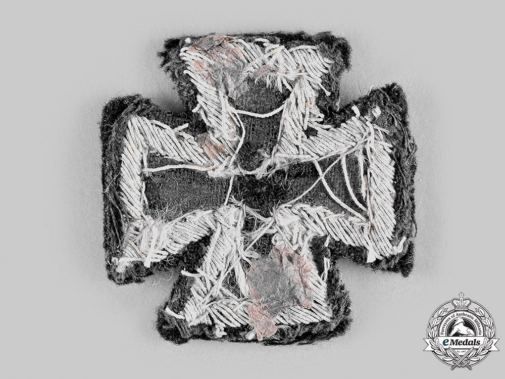 (Eisernes Kreuz 1939 I. Klasse, Stoffausführung). Reinstituted 1 September 1939. (1939-1945 issue). An extremely well-preserved cloth version of the 1939 Iron Cross I Class, consisting of a Cross Pattée with a black wool base, the obverse with a hand-embroidered silver aluminum wire frame, with a central hand-embroidered black mobile swastika, the reverse with the remnants of an adhesive, unmarked, measuring 52 mm (w) x 52 mm (h), weighing 3.5 grams, in extremely fine condition.
