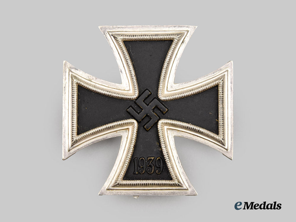 (Eisernes Kreuz 1939 I. Klasse). Reinstituted 1 September 1939. (1939-1945 issue). Constructed of a non-magnetic metal, consisting of a Cross Pattée with a blackened core within a ribbed silver frame, the obverse with a central mobile swastika, the six o’clock arm with a reinstitution date of “1939”, the reverse with a block hinge and vertical pinback meeting a round wire catch, unmarked but with the frame demonstrating the characteristics of manufacture by Rudolf Souval, Vienna, containing a blackened brass core likely manufactured by Friedrich Orth, Vienna, measuring 44.18 mm (w) x 44.17 mm (h), weighing 21.4 grams, in extremely fine condition.