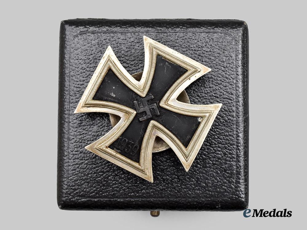 (Eisernes Kreuz 1939 I. Klasse mit Schraubscheibe und Etui). Reinstituted 1 September 1939. (1939-1945 issue). Constructed of iron and silver, consisting of a Cross Pattée with a blackened magnetic iron core within a ribbed silver frame, the obverse with a central mobile swastika, the six o’clock arm with a reinstitution date of “1939”, the reverse with a central threaded screw post retaining an original backplate, topped by a stabilizer, the six o’clock arm maker marked with LDO code “L/12” for C.E. Juncker, Berlin, measuring 44.00 mm (w) x 43.98 mm (h), weighing 18.3 grams, accompanied by its original presentation case, constructed of a light wooden frame with a faux black leather exterior liner, the interior with a white rayon lid liner and intact hinge cover, the former bearing a gilded LDO insignia, with a depressed black rayon medal bed, closing with a functional metal spring catch with exterior stud release, measuring 70 mm (w) x 70 mm (l) x 20 mm (h), demonstrating minor scratching to the core, a rare variation in near extremely fine condition.