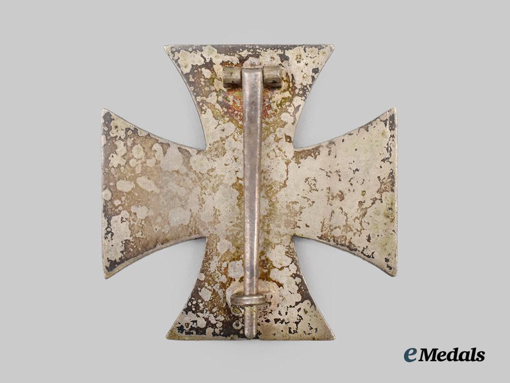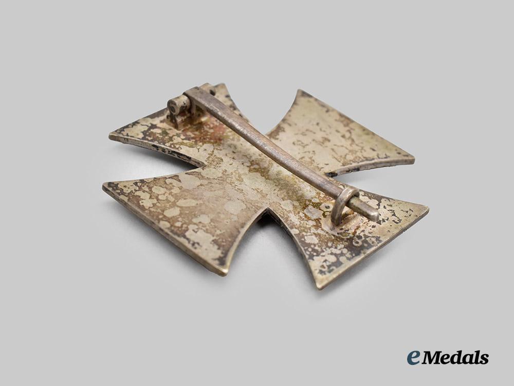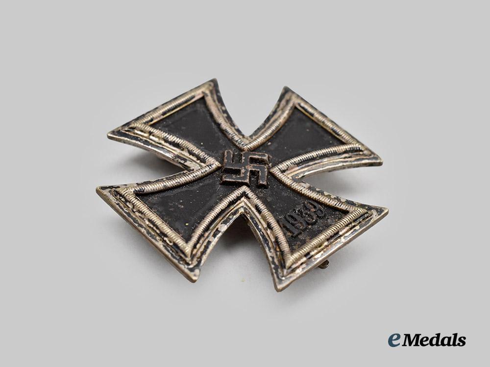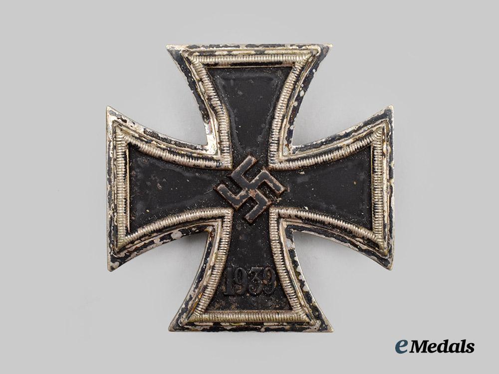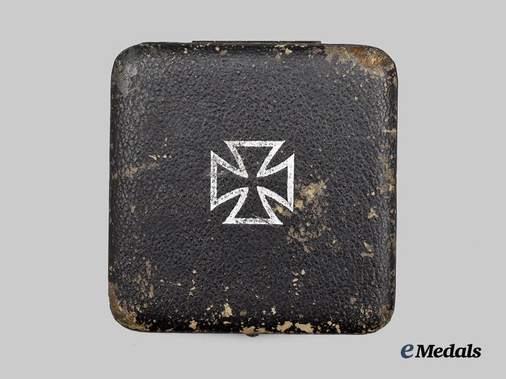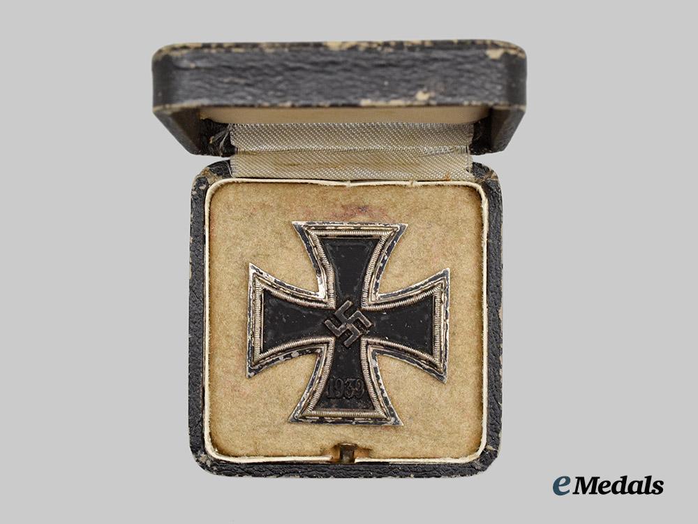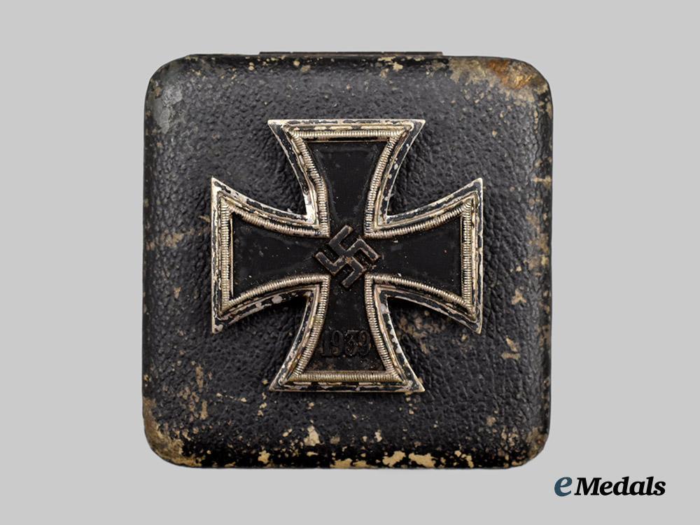 (Eisernes Kreuz 1939 I. Klasse mit Etui). Reinstituted 1 September 1939. (1939-1945 issue). Constructed of iron and silver, consisting of a Cross Pattée with a blackened magnetic iron core within a ribbed silver frame, the obverse with a central mobile swastika, the six o’clock arm with a reinstitution date of “1939”, the reverse with a barrel hinge and vertical pinback meeting a flat wire catch, the reverse of the pinback maker marked with Präsidialkanzlei code “20” for C.F. Zimmermann, Pforzheim, measuring 44.22 mm (w) x 44.35 mm (h), weighing 17.3 grams, accompanied by its period original presentation case, constructed of a pressed card stock frame with a faux black leather exterior liner, the lid bearing a silvered Cross Pattée, the interior with a white rayon lid liner and intact hinge cover, with a slotted beige felt medal bed, unmarked, measuring 70 mm (w) x 70 mm (l) x 25 mm (h), demonstrating moderate loss of finish throughout the core and frame of the cross, with additional material fatigue visible to the case which includes the loss of functionality to its catch, in overall very fine condition.