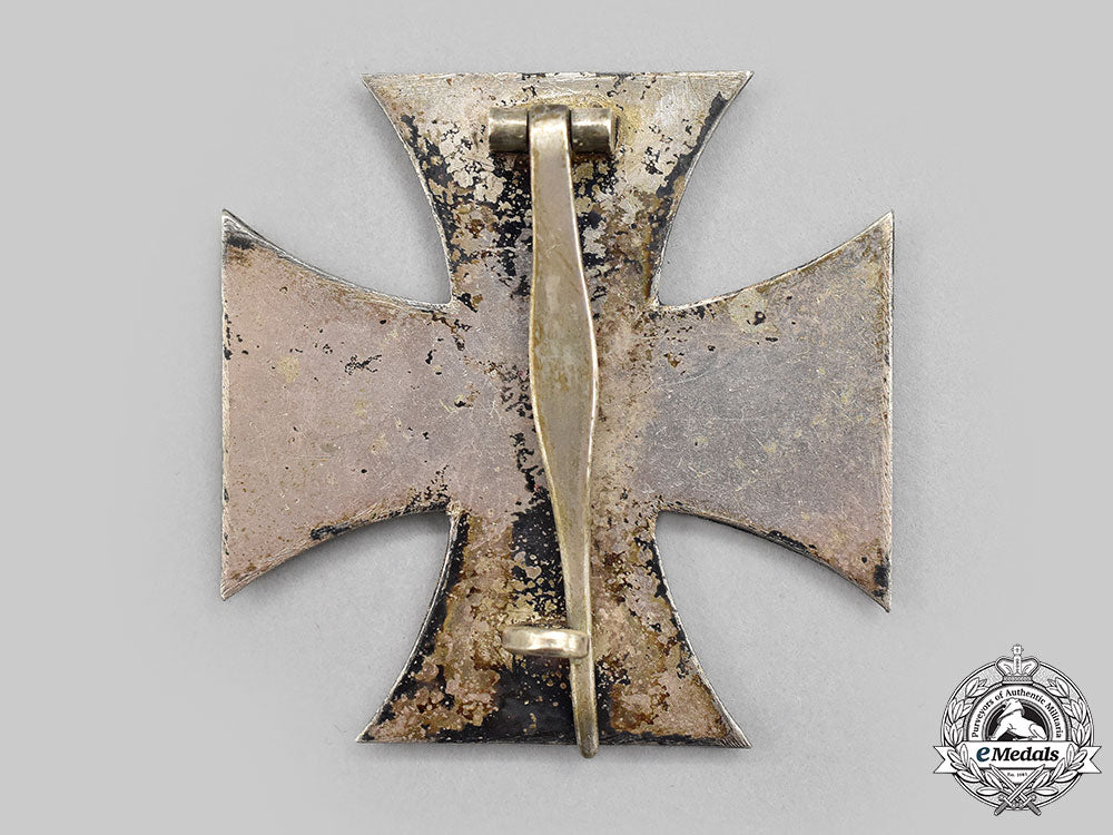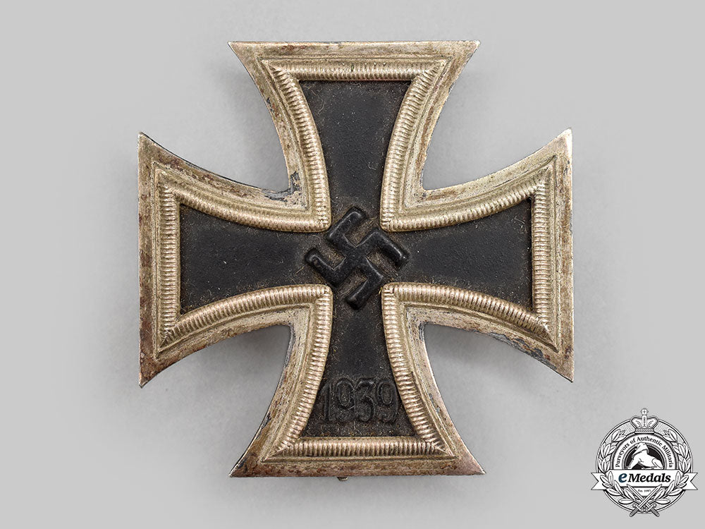 (Eisernes Kreuz 1939 I. Klasse mit Etui). Reinstituted 1 September 1939. (1939-1945 issue). Constructed of iron and silver, consisting of a Cross Pattée with a blackened magnetic iron core within a ribbed silver frame, the obverse with a central mobile swastika, the six o’clock arm with a reinstitution date of “1939”, the reverse with a barrel hinge and banjo-style pinback meeting a round wire catch, unmarked, measuring 44.06 mm (w) x 47.30 mm (h), weighing 18.3 grams, accompanied by its period original presentation case, constructed of a light wooden frame with a faux black leather exterior liner, the lid bearing a silver Cross Pattée, the interior with a white rayon lid liner and intact hinge cover, with a slotted beige felt medal bed, closing with a functional metal spring catch with exterior stud release, unmarked, measuring 68 mm (w) x 68 mm (l) x 20 mm (h), in overall near extremely fine condition.