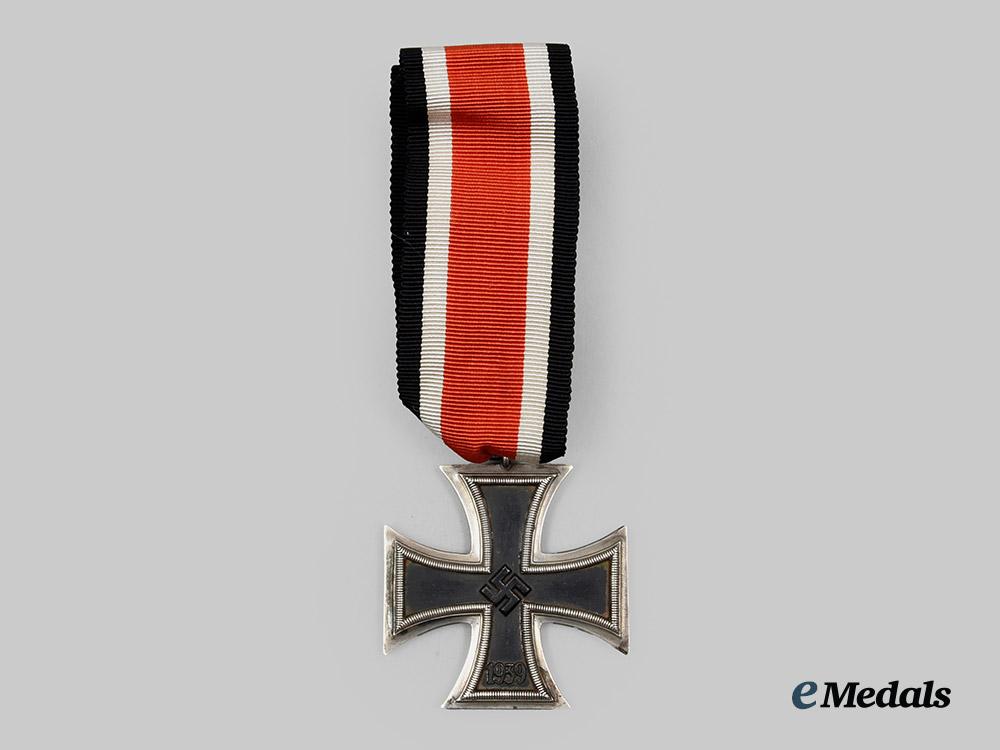 (Eisernes Kreuz 1939 II. Klasse). Reinstituted 1 September 1939. (1939-1945 issue). Constructed of iron and silver, on loop for suspension from its period original ribbon, consisting of a Cross Pattée with a blackened magnetic iron core within a ribbed silver frame, the obverse with a central mobile swastika, the six o’clock arm with a reinstitution date of “1939”, the reverse six o’clock arm with an initial institution date of “1813”, unmarked but demonstrating the characteristics of an early Schinkel-form verison, measuring 44.18 mm (w) x 48.10 mm (h), weighing 21.3 grams, in near extremely fine condition.