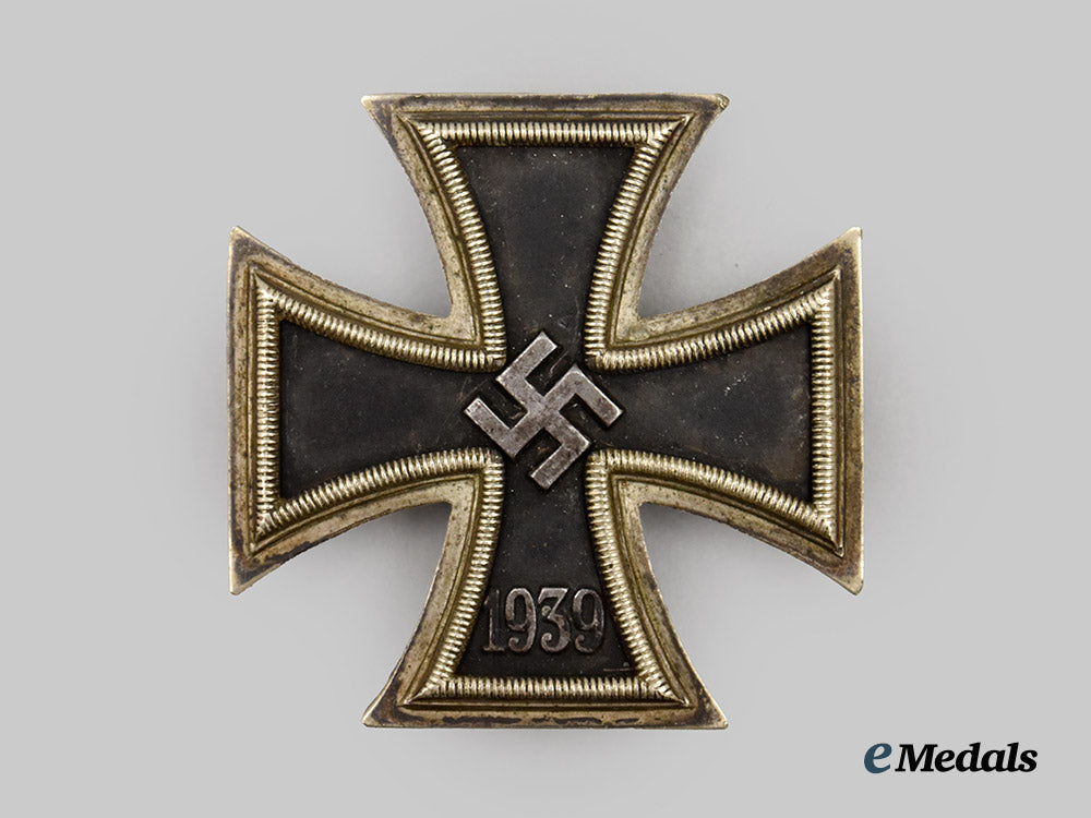 (Eisernes Kreuz 1939 I. Klasse). Reinstituted 1 September 1939. (1939-1945 issue). Constructed of iron and silver, consisting of a Cross Pattée with a blackened magnetic iron core within a ribbed silver frame, the obverse with a central mobile swastika, the six o’clock arm with a reinstitution date of “1939”, the reverse with a block hinge and tapering vertical pinback meeting a round wire catch, unmarked but demonstrating the characteristics of manufacture by Klein & Quenzer, Idar-Oberstein, with a Type A core, measuring 44.23 mm (w) x 44.20 mm (h), weighing 20.8 grams, demonstrating minor loss of finish throughout the core, in better than very fine condition.