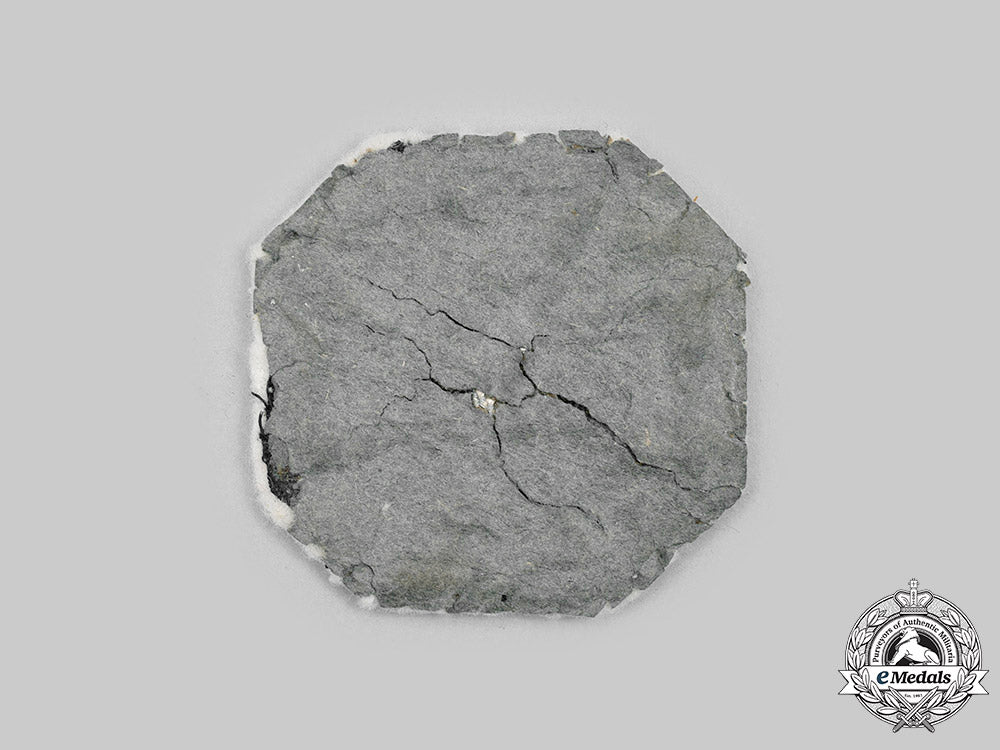 (Eisernes Kreuz 1939 I. Klasse, Stoffausführung). Reinstituted 1 September 1939. (1939-1945 issue). A rare cloth version of the 1939 Iron Cross I Class, constructed of an octagonal white wool backer which retains a dark grey paper stock reverse liner, the obverse bearing a Cross Pattée consisting of a dark grey threaded frame with its inner and outer edges trimmed with twisted and rolled silver aluminum wire piping, the core constructed of black doeskin wool, with a central silver aluminum wire mobile swastika, the six o’clock arm with a reinstitution date of “1939” of identical construction, unmarked, measuring 48 mm (w) x 47 mm (h) overall, a rare cloth version in extremely fine condition.