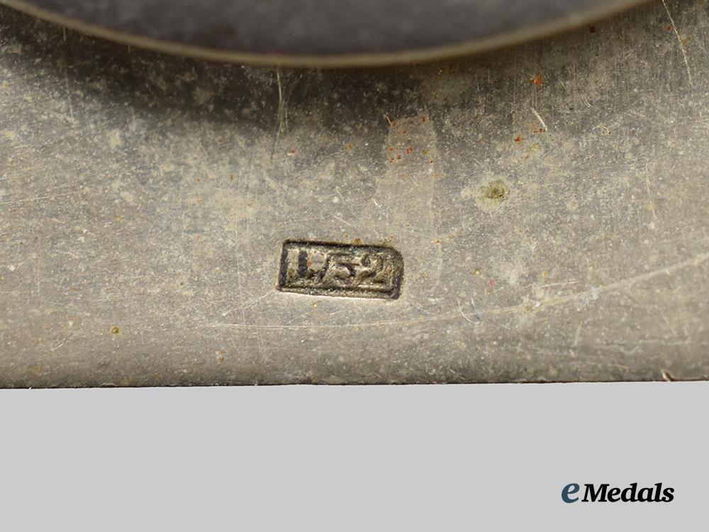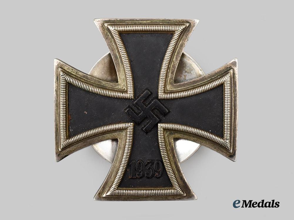 (Eisernes Kreuz 1939 I. Klasse, Schraubscheibe). Reinstituted 1 September 1939. (1939-1945 issue). Constructed of iron and silver, consisting of a Cross Pattée with a blackened magnetic iron core within a ribbed silver frame, the obverse with a central mobile swastika, the six o’clock arm with a reinstitution date of “1939”, the reverse with a central threaded screw post emanating from a circular disc, retaining an original backplate and nut, the six o’clock arm maker marked with LDO code “L/52” for C.F. Zimmermann, Pforzheim, measuring 44.42 mm (w) x 44.41 mm (h), weighing 29.0 grams, an unusual example featuring a classic Zimmermann core within a 1914-style frame and with atypical hardware for this manufacturer, demonstrating some bending to the frame itself, in extremely fine condition.