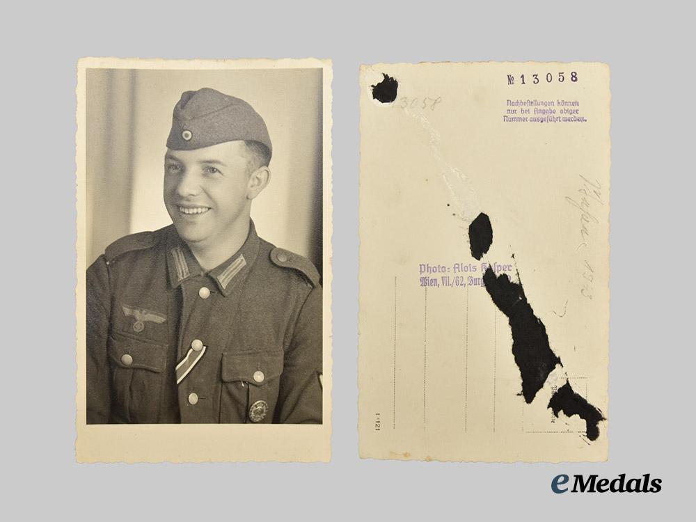 4. A studio portrait depicting Brunner in a Heer Enlisted uniform, wearing the 1939 Iron Cross II Class ribbon and Gold Grade Wound Badge, the reverse in postcard format and stamped with a Vienna studio mark, also bearing a handwritten date of “1943”, measuring 9 cm (w) x 14 cm (h), demonstrating the remnants of card stock to the reverse consistent with previous album display, in extremely fine condition.