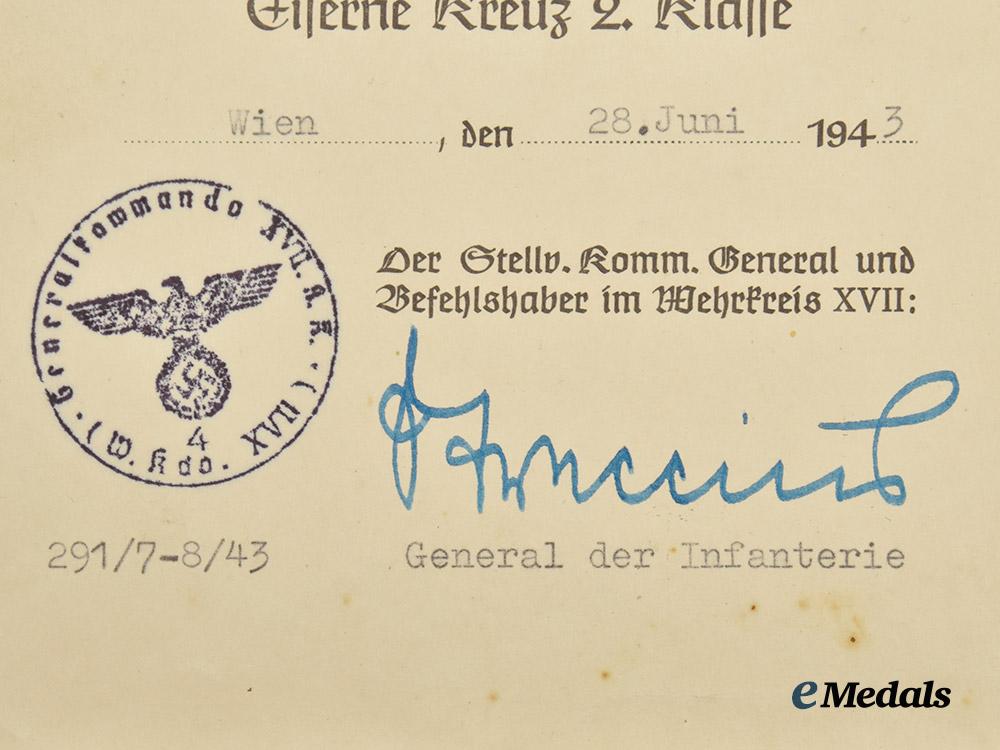 2. An award document for the 1939 Iron Cross II Class, named to Brunner as a Gefreiter, awarded in Vienna on 28 June 1943, certified by the handwritten signature of General der Infanterie Alfred Streccius (German Cross in Silver, 5 August 1943), measuring 13.5 cm (w) x 20 cm (h), demonstrating some material fatigue, in better than very fine condition.